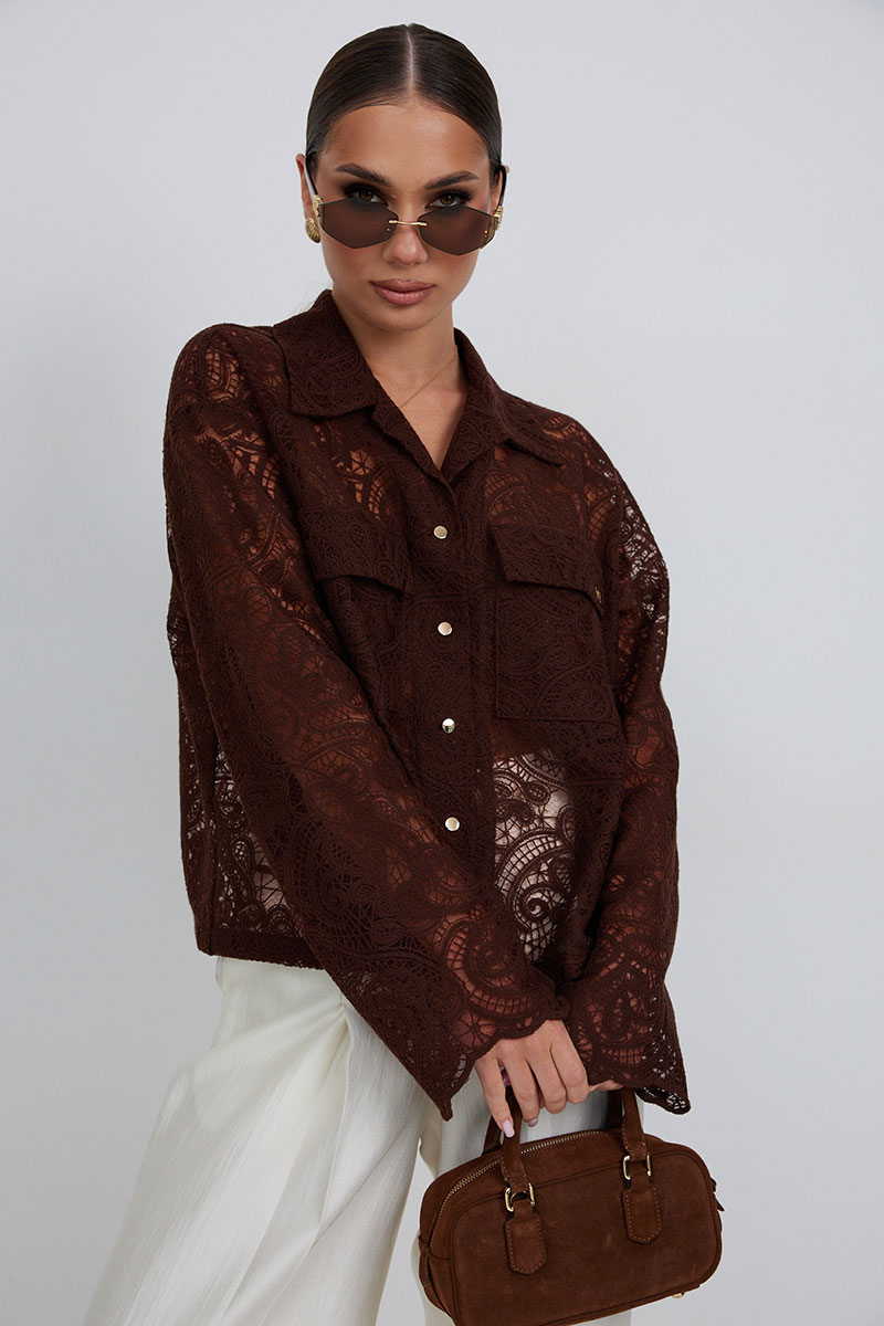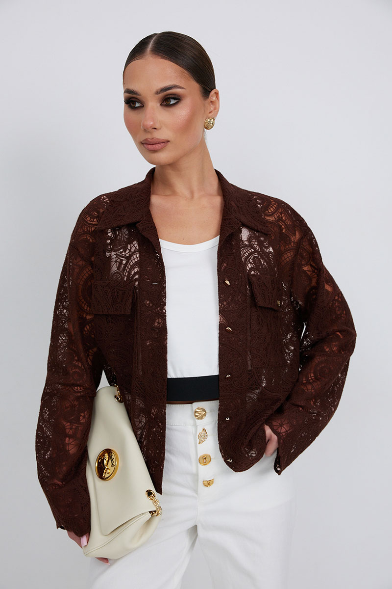 Блузка из кружевной ткани свободного силуэта. По переду центральная застежка на петли и пуговицы, сверху накладные карманы с клапанами. Втачной рукав слегка расширен к низу. Воротник рубашечный.