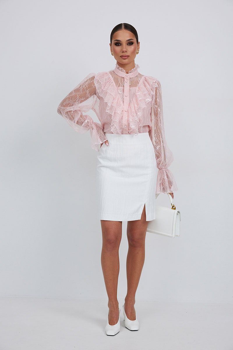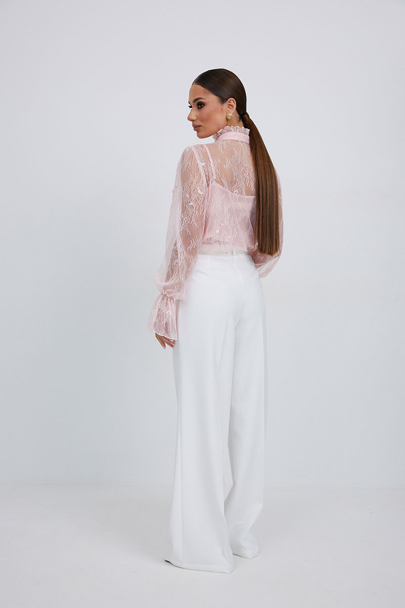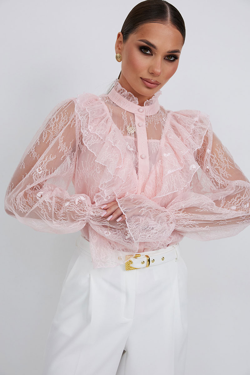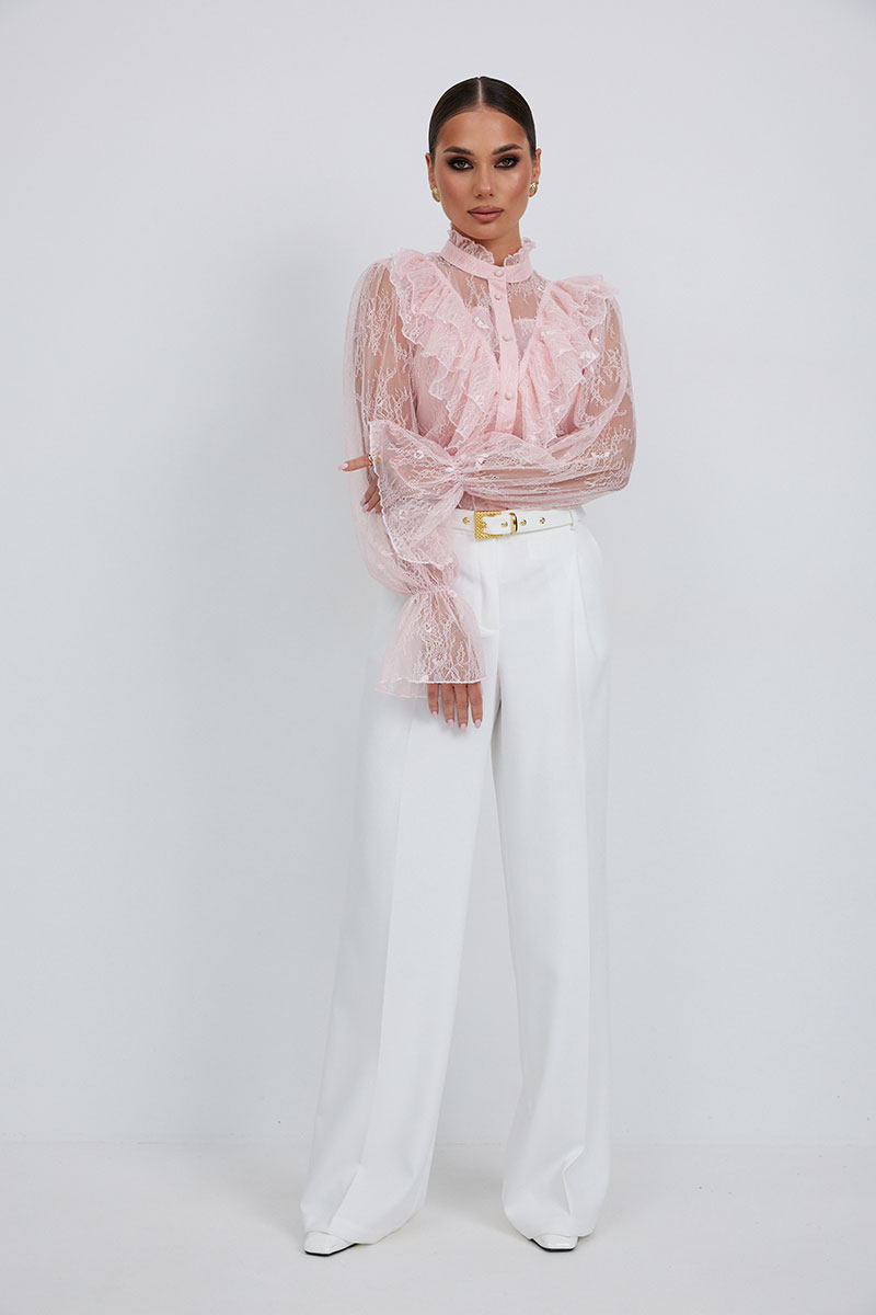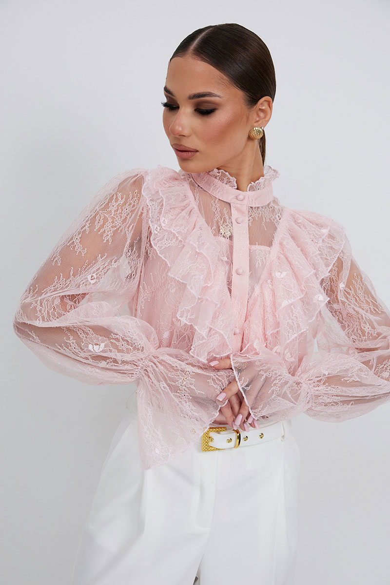 Блузка женская свободного силуэта, из легчайшего кружева. По переду подрез с воланами. Застежка на планку с декоративными пуговицами. Воротник - стойка с небольшой рюшей. Рукав длинный объемный со сборкой в верхней части, в нижней части рукав собран на эластичную тесьму и образует волан.