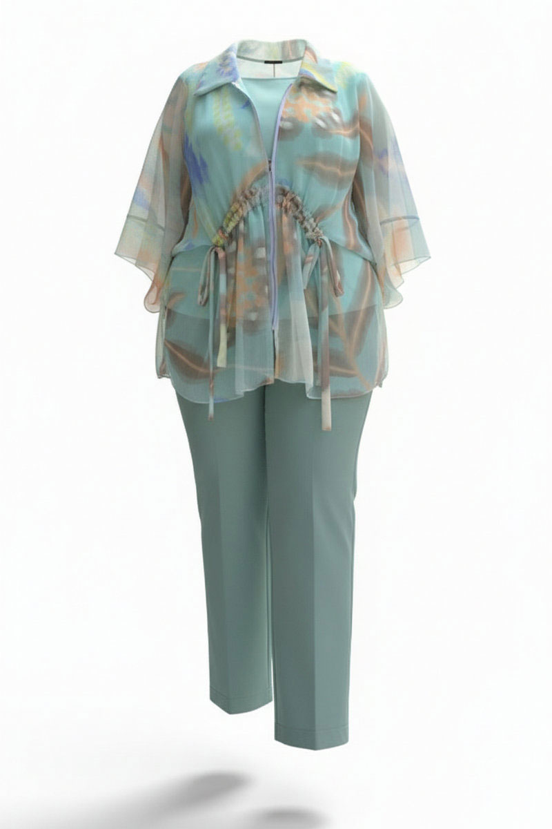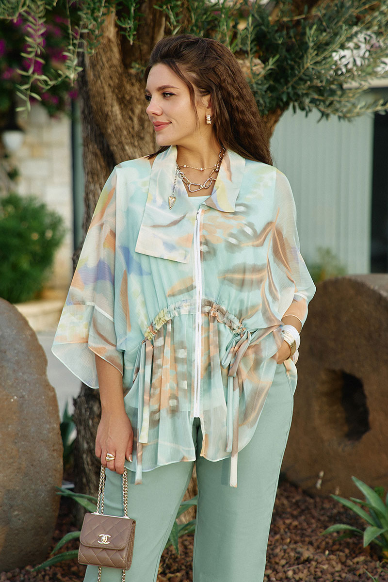 Комплект женский, двух предметный, состоящий из блузки и блузы. Этот комплект читает женственность спокойно — без пафоса. Он рассказывает о комфорте, о внимании к текстурам и о желании выглядеть легко, но продуманно. Вместе они создают образ, где современная минималистика встречается с женственной романтикой: практично, но вдохновляюще. Главный акцент комплекта – это невесомая шифоновая блузка с абстрактным цветочным принтом в пастельных тонах, создающая ощущение воздушности и легкости. Ее свободный крой и завязки на талии позволяют регулировать силуэт, добавляя динамичности. Его дополняет базовая белая блуза, которая служит чистым холстом для более яркого элемента. Блузка свободного силуэта, с центральной застёжкой на тесьму молнию по переду; воротник в блузке отложной, ассиметричный. В качестве отделочного элемента по переду блузки - кулиса со шнуром из основной ткани. Рукав цельнокроеный, длиной 7/8, с притачной манжетой. По спинке отрезная кокетка. Низ в блузке ассиметричный. Блуза прямого силуэта с округлой формой горловины и нагрудными вытачками по полочке. Спинка без особенностей. Данный комплект имеет множество вариантов стилизации. Можно неебрежно заправить переднюю часть блузы в джинсы — блузка свободно расправится сверху. Застегнуть молнию наполовину, чтобы создать V-образный переход между шифоном и топом.