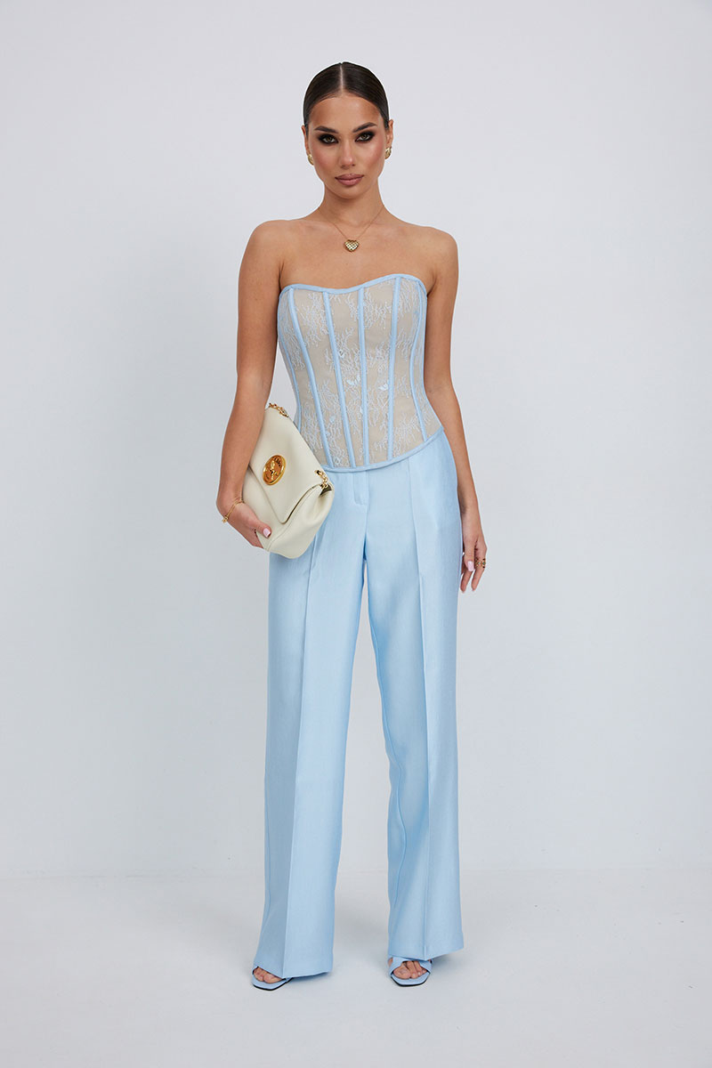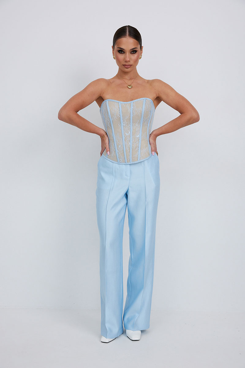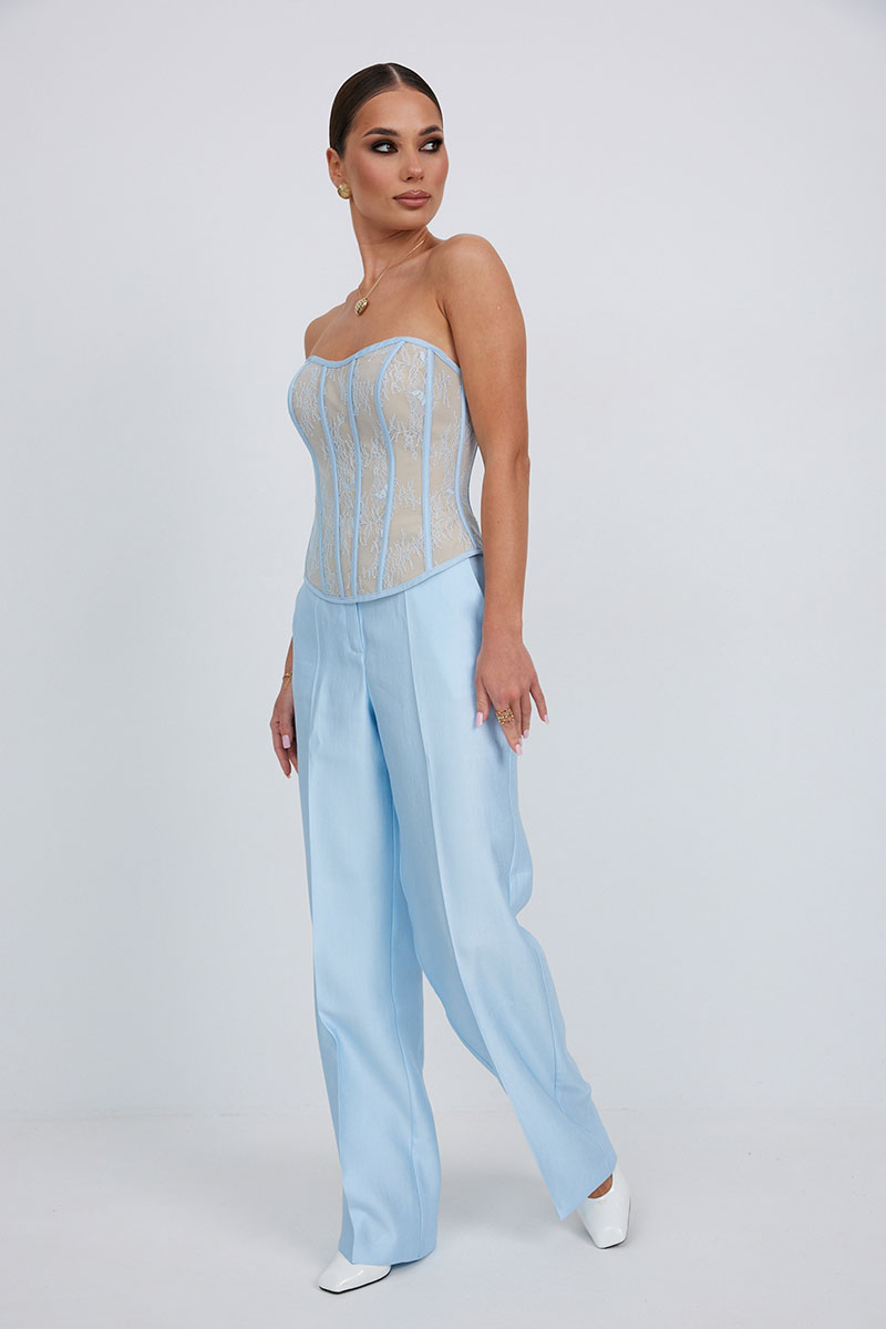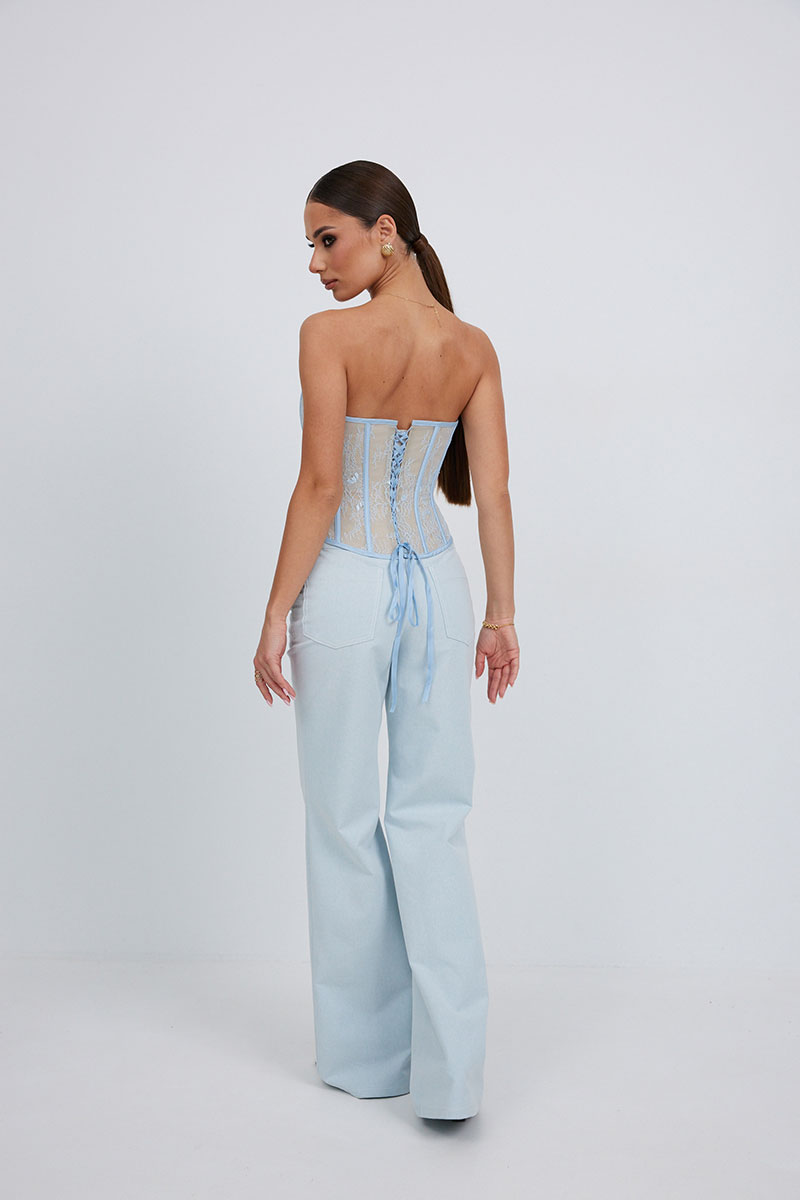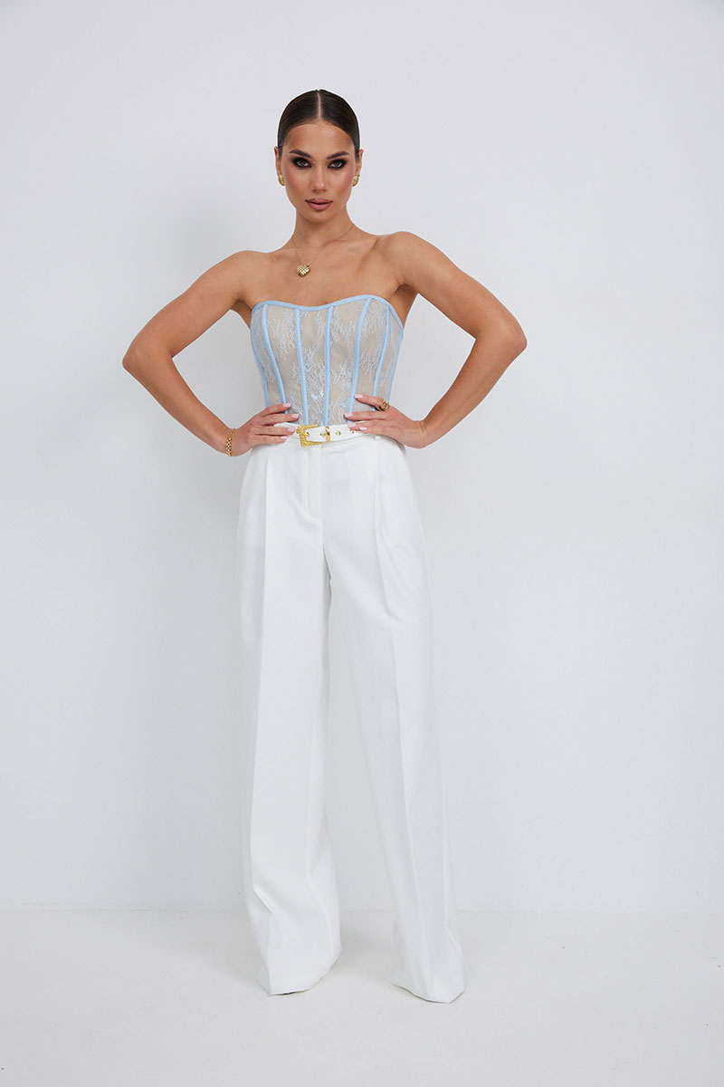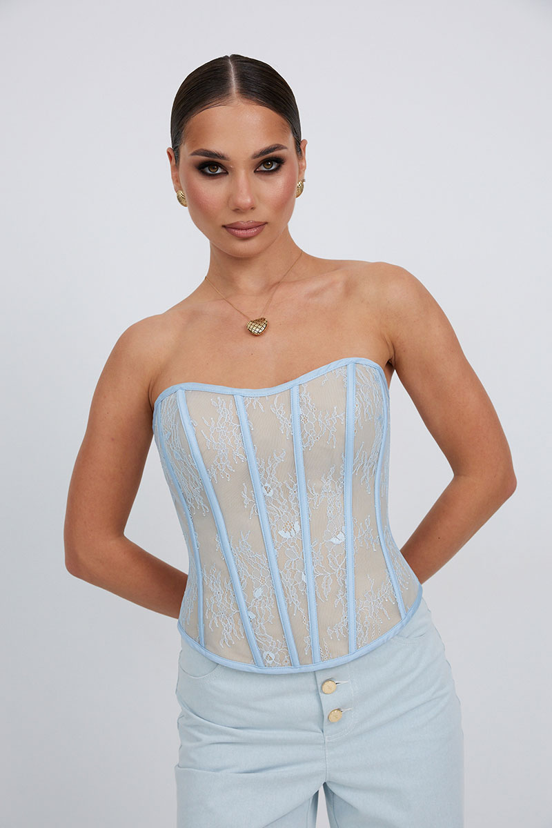 Укороченная блузка из кружева с сатиновой подкладкой, прилегающего силуэта. По спинке шнуровка. По переду и спинке по три рельефных шва. Блузка отлично подойдет для коктейльных и вечерних выходов, ее можно использовать, как самостоятельный предмет одежды или надевать вторым слоем поверх рубашек или платьев.