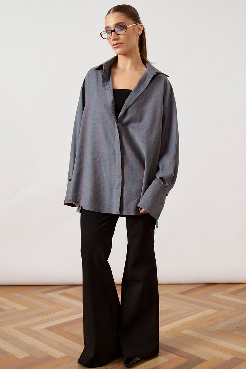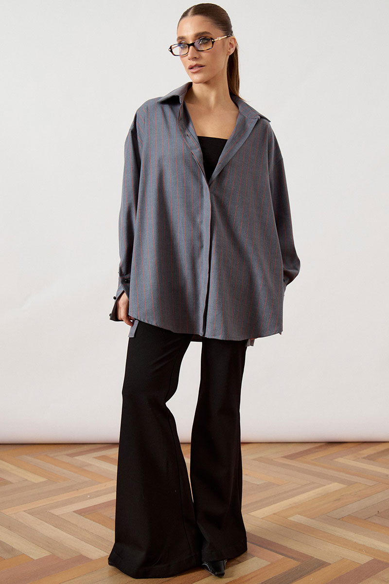 Рубашка женская свободного силуэта (оверсайз), выполнена из плотной костюмно-плательной ткани в вертикальную полоску. Изделие с отложным воротником на стойке и центральной застежкой на петли и пуговицы, закрытой притачной планкой (супатная застежка). Полочка с цельнокроеной планкой, спинка с горизонтальной кокеткой и мягкой складкой для обеспечения свободы движения. Линия плеча спущена, рукав длинный, одношовный, втачной в открытую пройму. Низ рукава оформлен широкой притачной манжетой с застежкой на пуговицу и глубокими складками. Линия низа изделия прямая, с небольшим перепадом длины: спинка слегка длиннее полочки, в боковых швах выполнены разрезы.