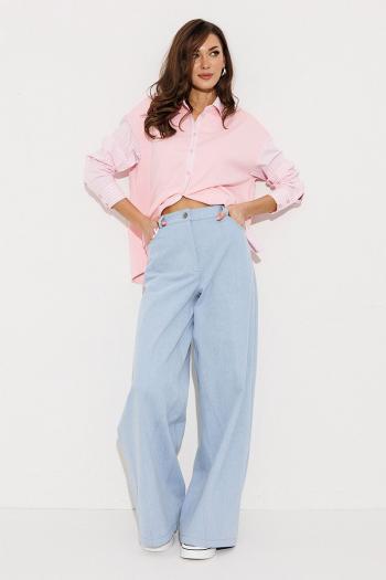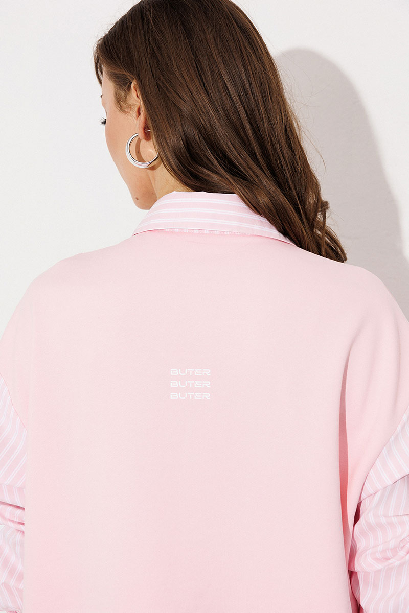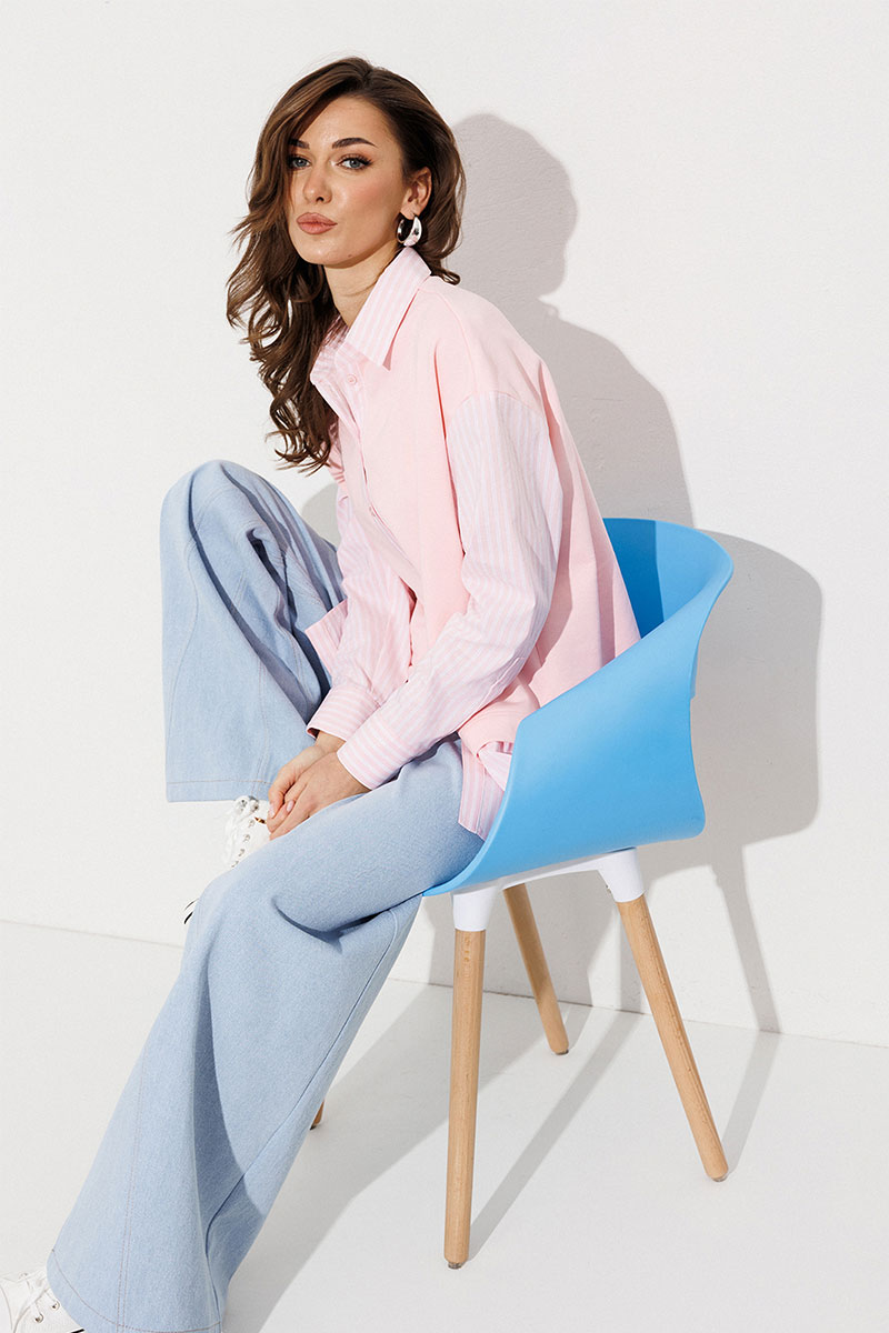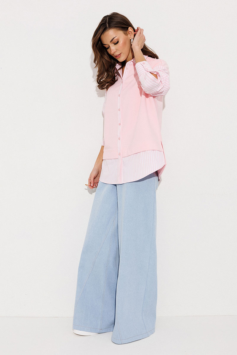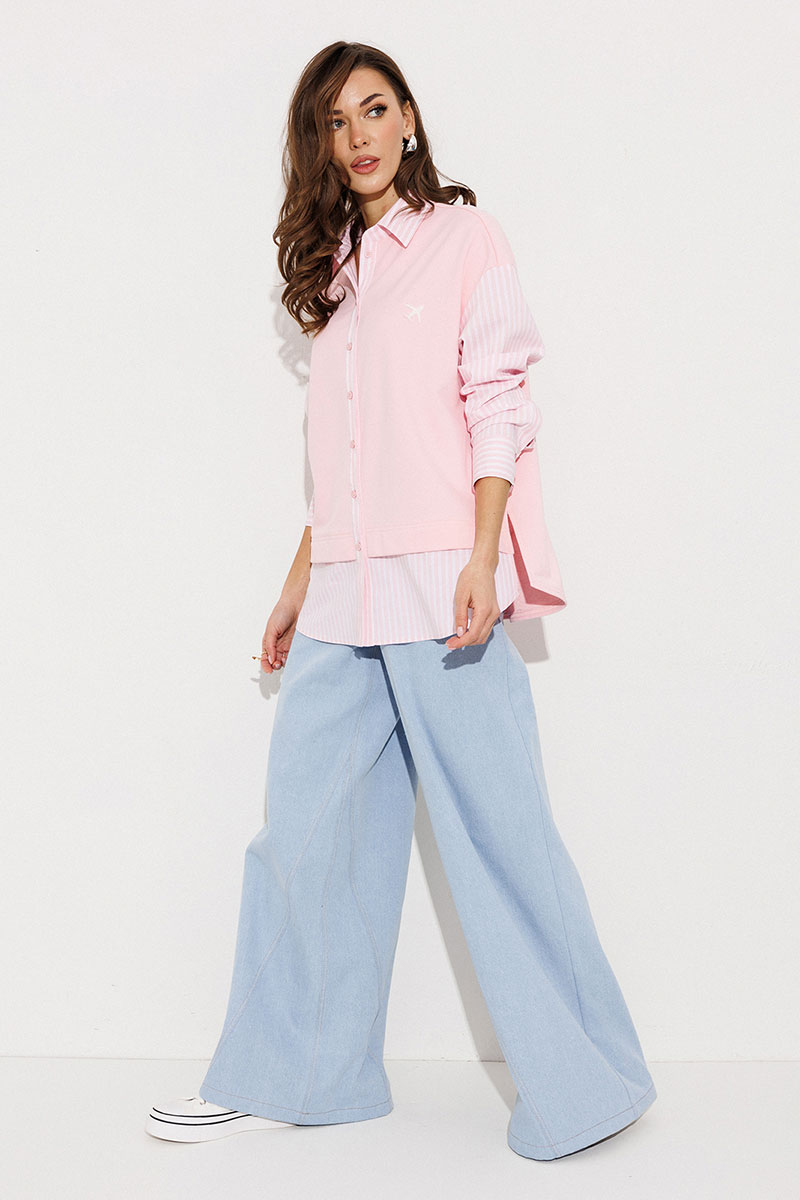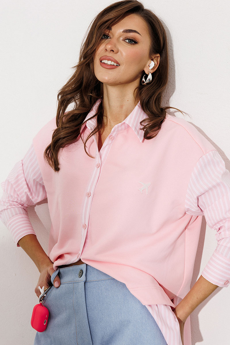 Блузка, комбинированная прямого силуэта, с втачным одношовным рукавом, со складкой и манжетой, с застежкой на петли-пуговицы и спущенной линией плеча. Полочка из трикотажа и рубашечной ткани с центральной застежкой на петли-пуговицы и вышивкой "Самолет". Спинка из трикотажа с печатью "BUTER". Воротник рубашечный отложной на стойке. Спинка и полочка с фигурным низом. Внизу по боковым швам обработаны разрезы.