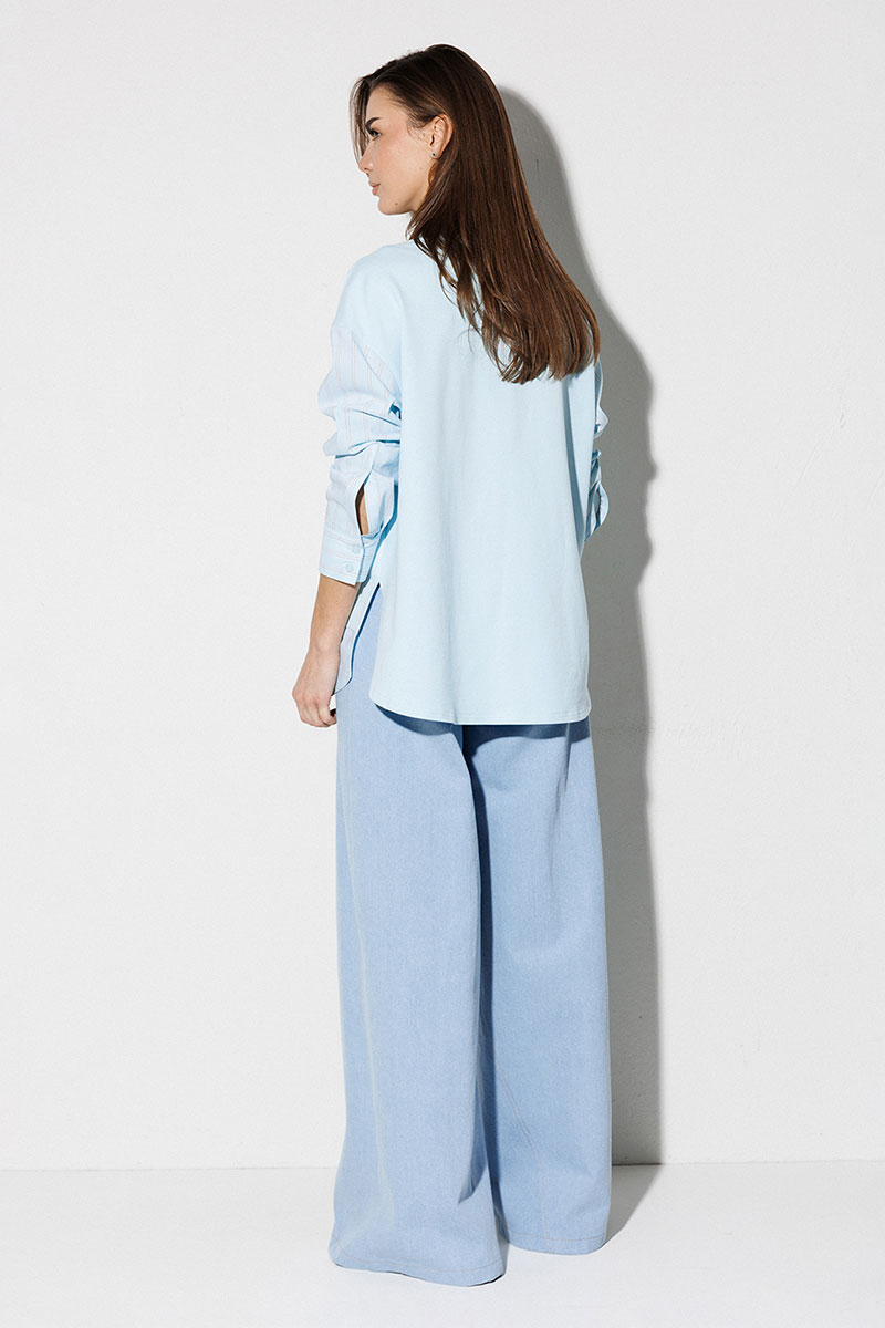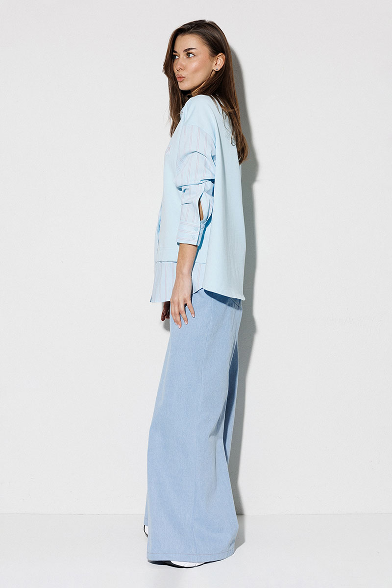 Блузка, комбинированная прямого силуэта, с втачным одношовным рукавом, со складкой и манжетой, с застежкой на петли-пуговицы и спущенной линией плеча. Полочка из трикотажа и рубашечной ткани с центральной застежкой на петли-пуговицы и вышивкой "Самолет". Спинка из трикотажа с печатью "BUTER". Воротник рубашечный отложной на стойке. Спинка и полочка с фигурным низом. Внизу по боковым швам обработаны разрезы.