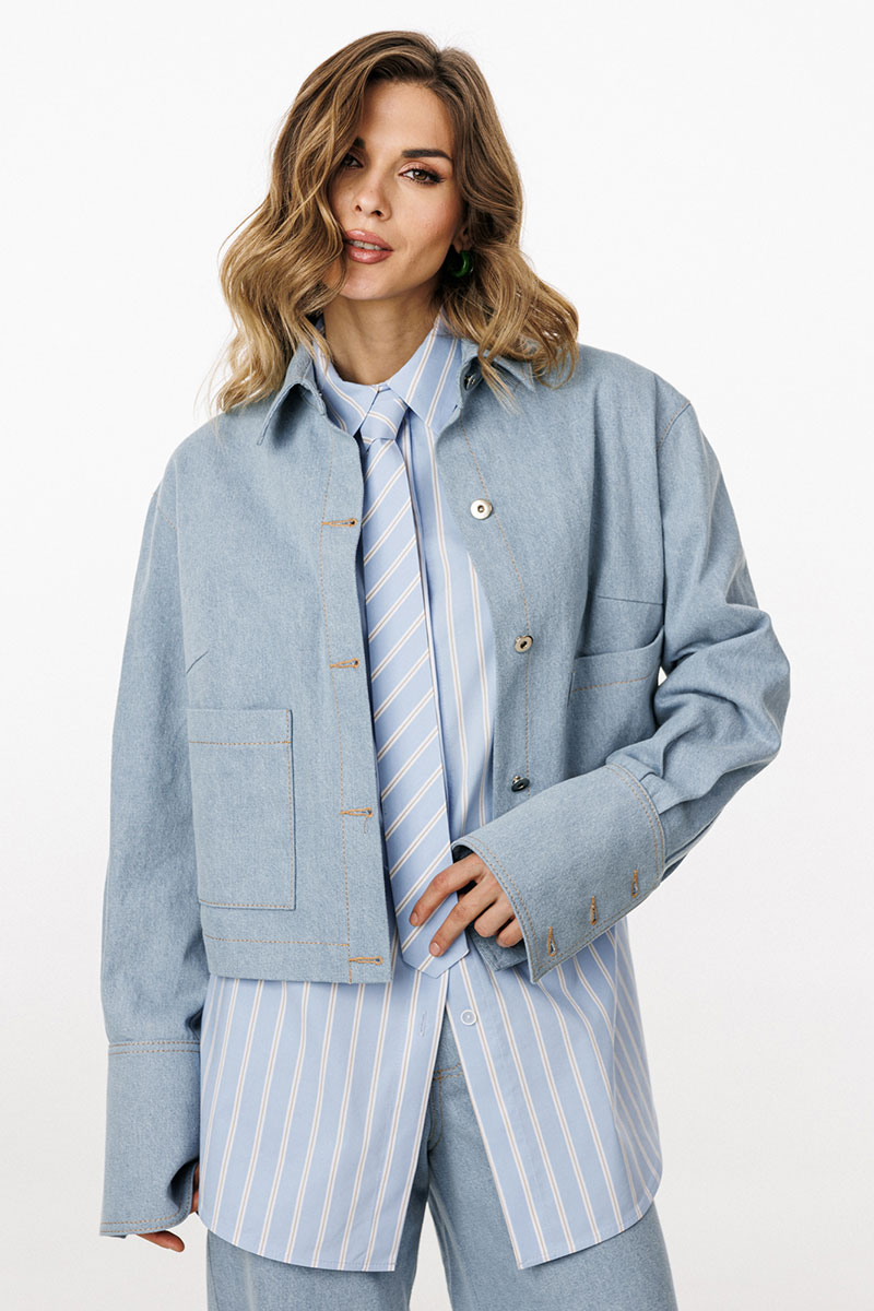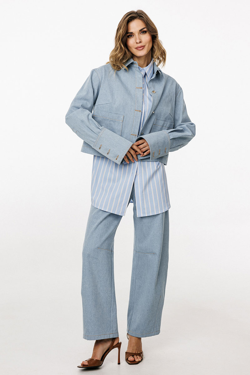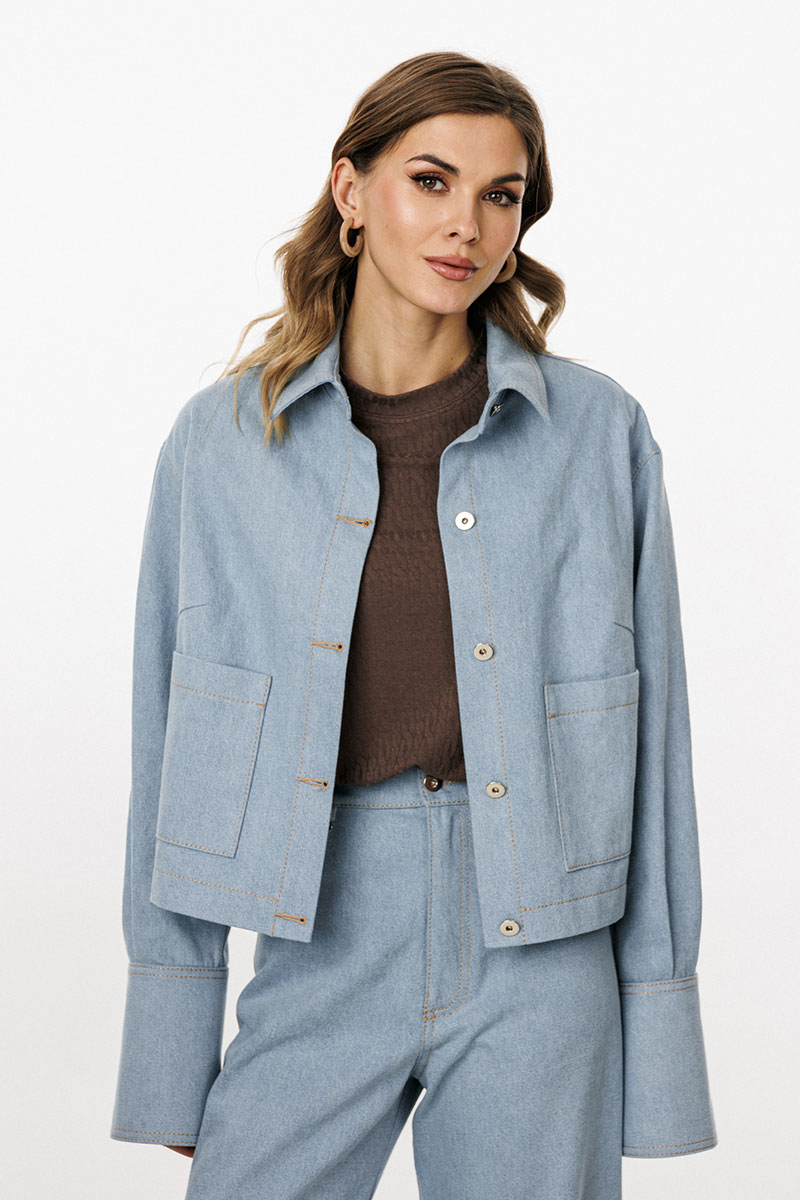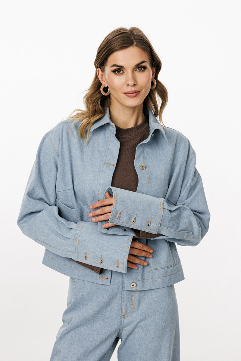 Блузка выполнена из плотного джинса. Блузка прямого силуэта, длиной ниже линии талии. Спереди накладные карманы и центральная застежка с планкой на пробивные пуговицы. На спинке кокетка и две складки. Воротник стояче-отложной с отрезной стойкой. Плечевой шов удлинен. Рукав рубашечного покроя, одношовный. Низ рукава на притачной манжете с застежкой на пробивные пуговицы. Рукав удлинен. Блузка декорирована по кокетке спинки нашивкой из натуральной кожи.