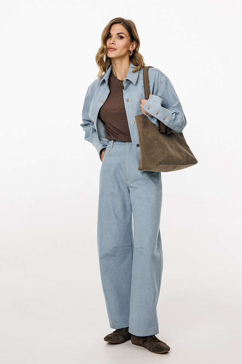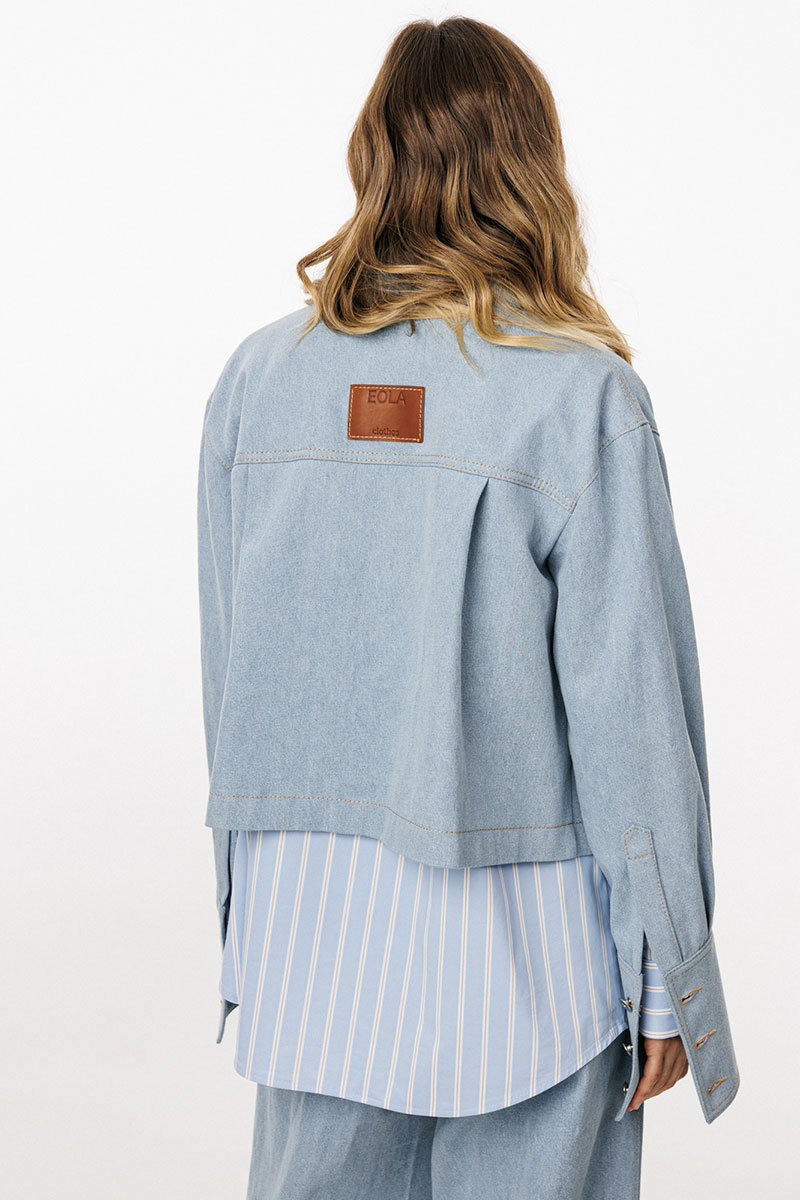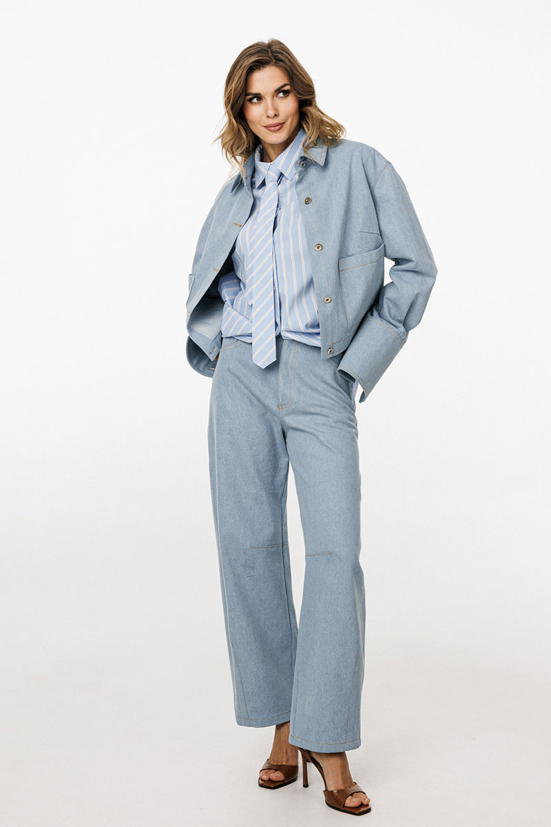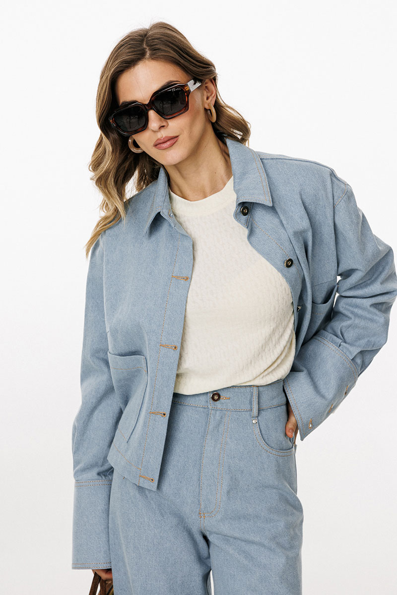 Блузка выполнена из плотного джинса. Блузка прямого силуэта, длиной ниже линии талии. Спереди накладные карманы и центральная застежка с планкой на пробивные пуговицы. На спинке кокетка и две складки. Воротник стояче-отложной с отрезной стойкой. Плечевой шов удлинен. Рукав рубашечного покроя, одношовный. Низ рукава на притачной манжете с застежкой на пробивные пуговицы. Рукав удлинен. Блузка декорирована по кокетке спинки нашивкой из натуральной кожи.