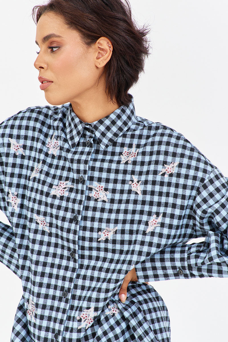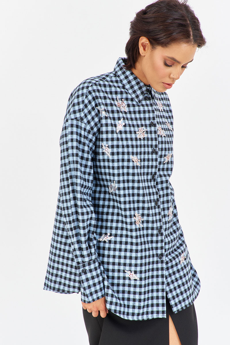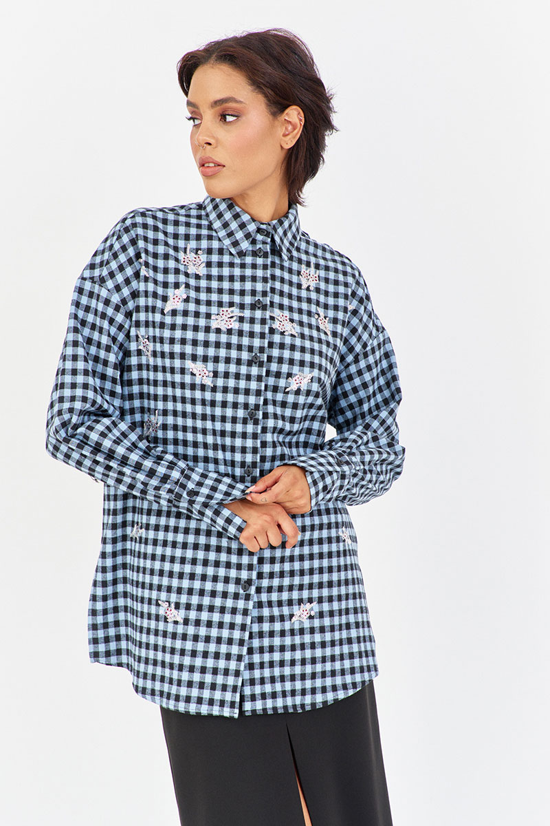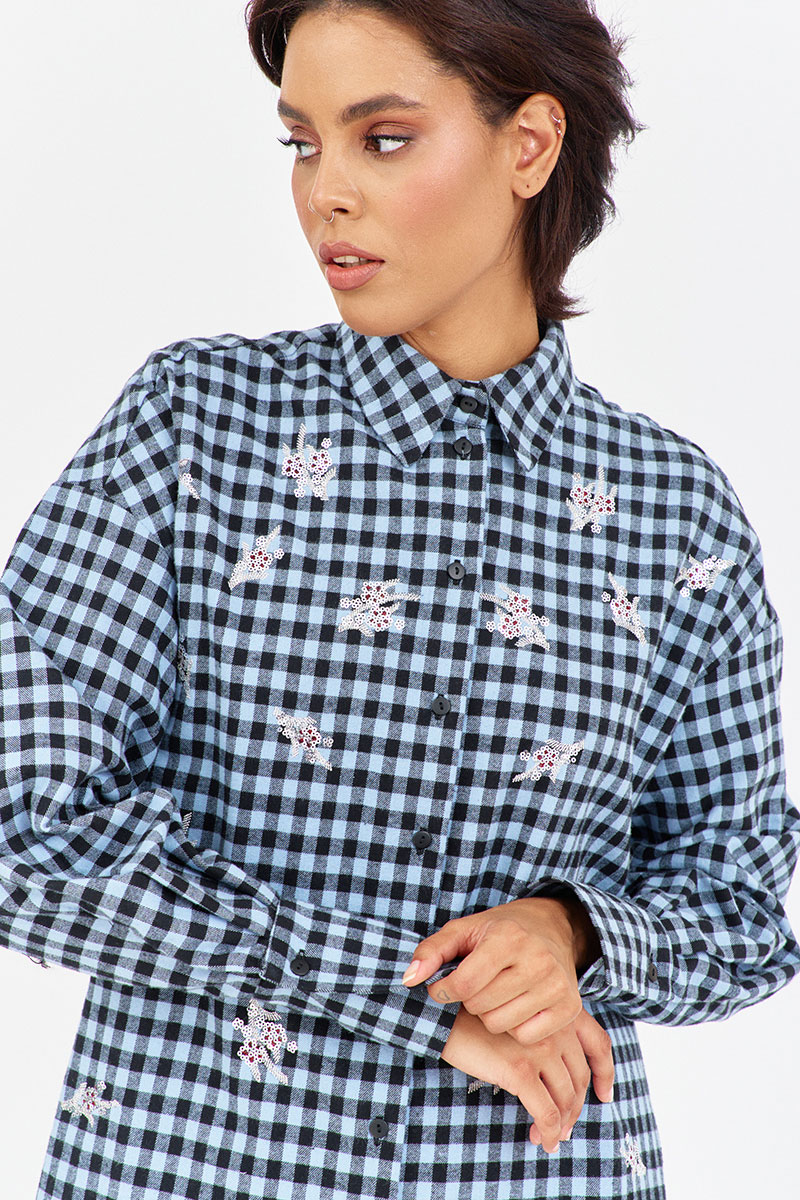 Рубашка в клетку с декоративной вышивкой. Характеристики: свободный силуэт, выполнена из фланелевой рубашечной ткани в черно-голубую клетку, центральная застежка на петли и пуговицы, по спинке отрезная кокетка и складка, по переду декоративная вышивка, низ рукава обработан манжетой на петли и пуговицы.