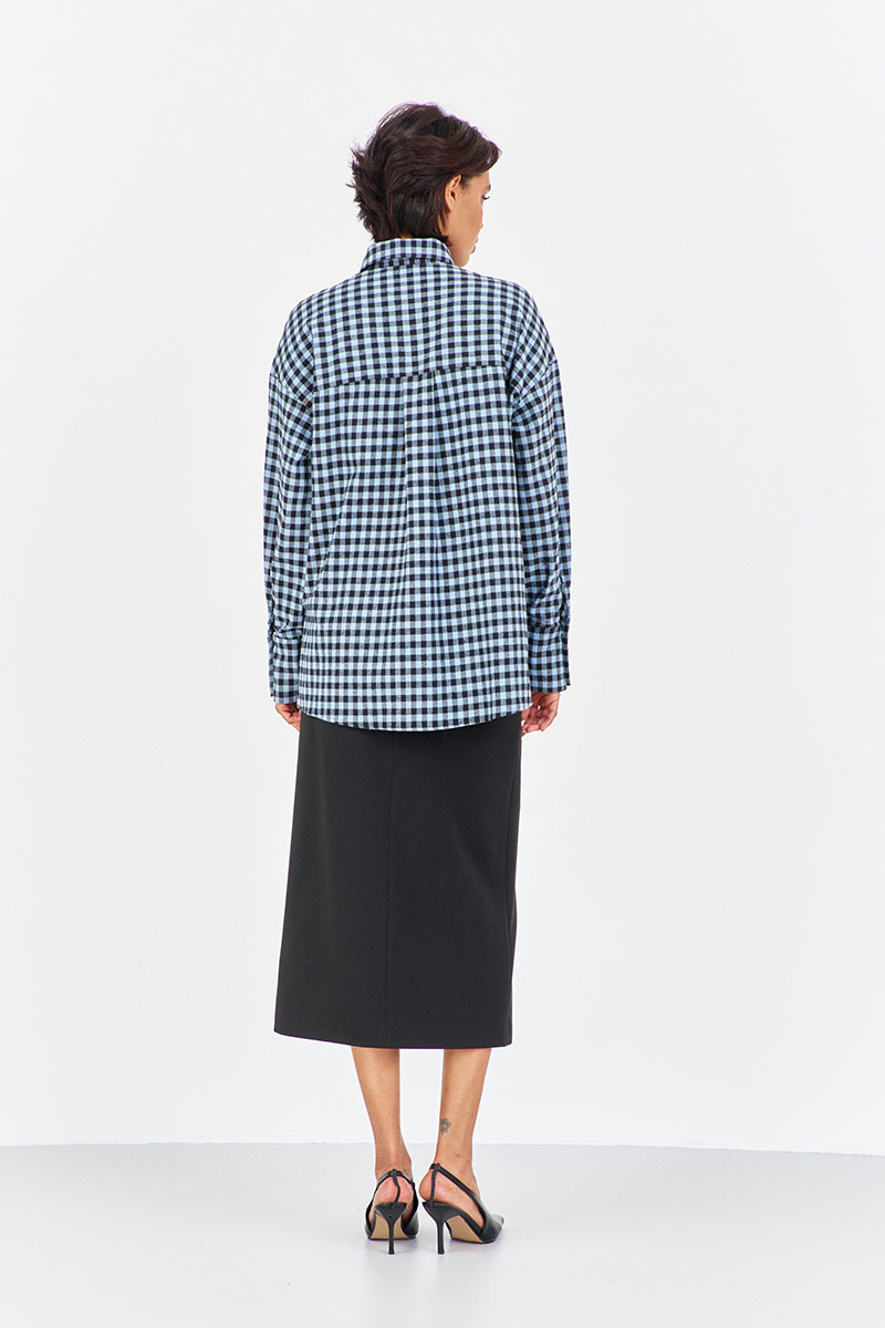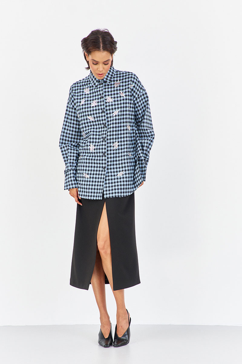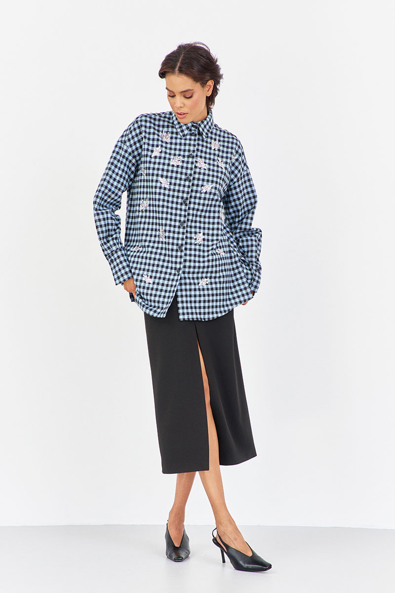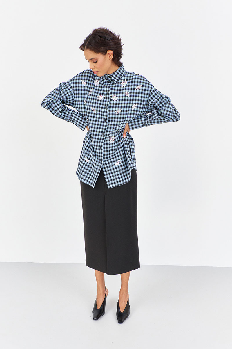 Рубашка в клетку с декоративной вышивкой. Характеристики: свободный силуэт, выполнена из фланелевой рубашечной ткани в черно-голубую клетку, центральная застежка на петли и пуговицы, по спинке отрезная кокетка и складка, по переду декоративная вышивка, низ рукава обработан манжетой на петли и пуговицы.