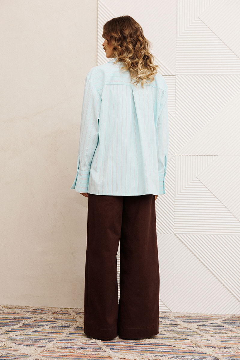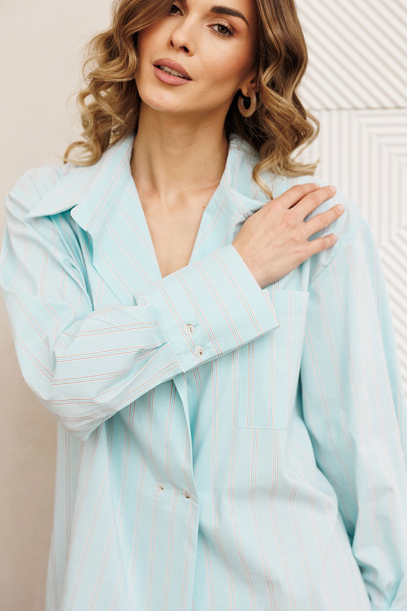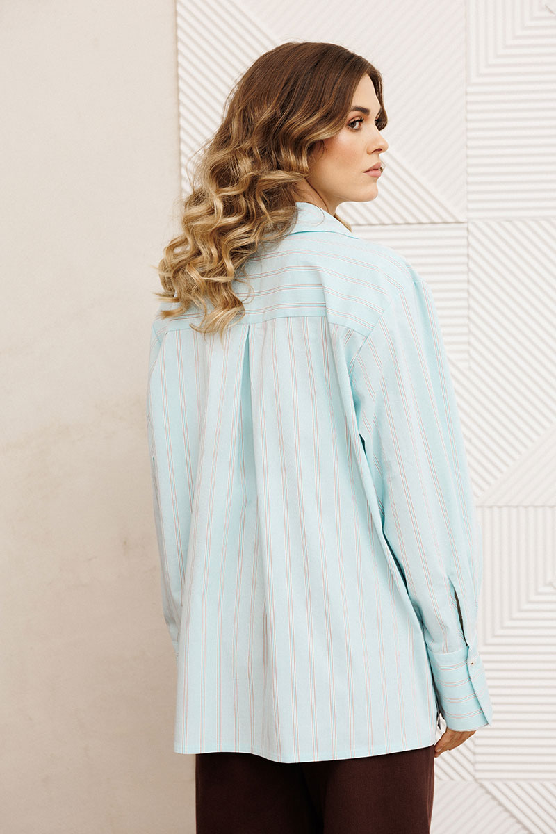 Рубашка свободного силуэта из хлопковой ткани в полоску. Перед с двубортной застежкой и карманом в районе груди. Воротник со стойкой. Спинка с кокеткой и складкой. Рукав втачной рубашечный с высокой манжетой на 2 петли и пуговицы.