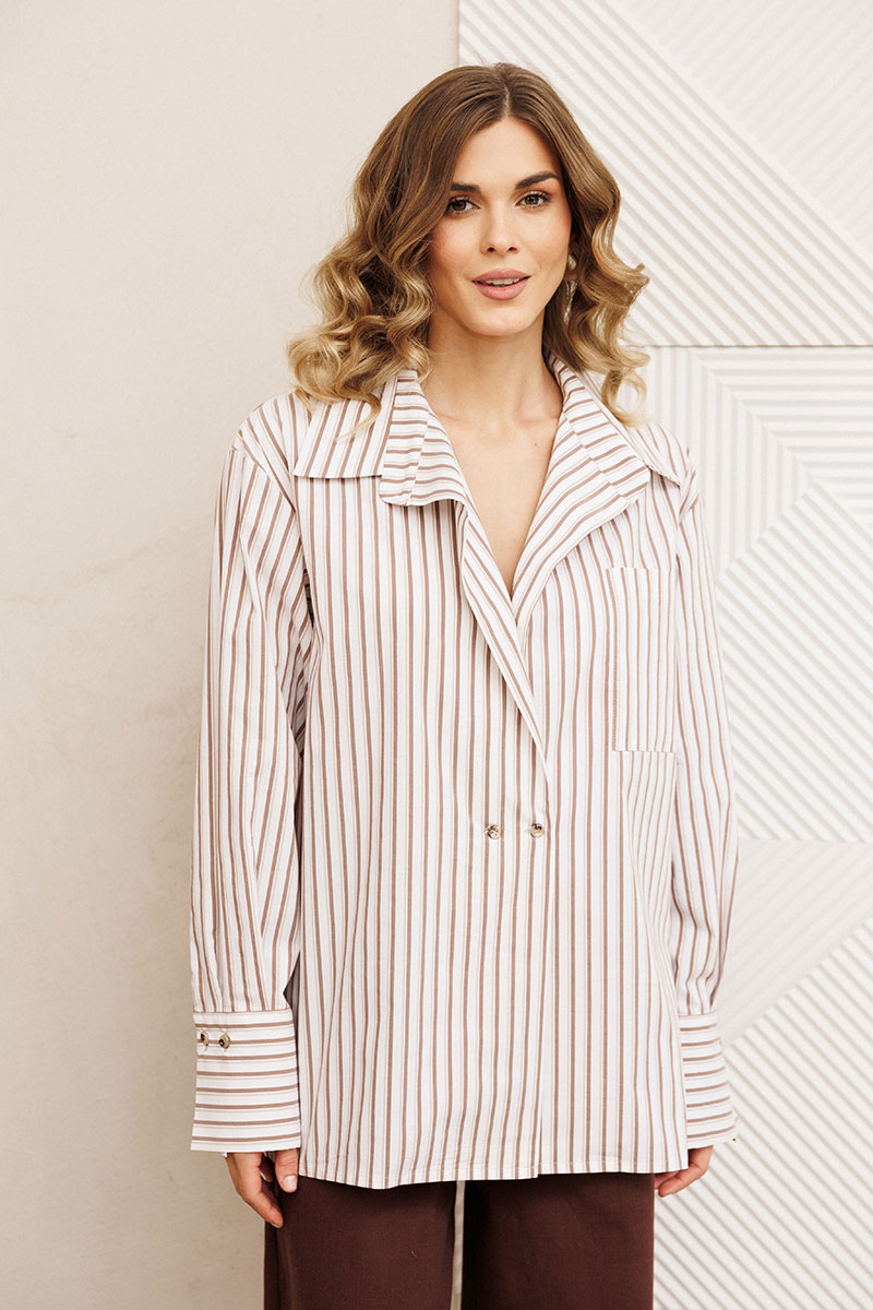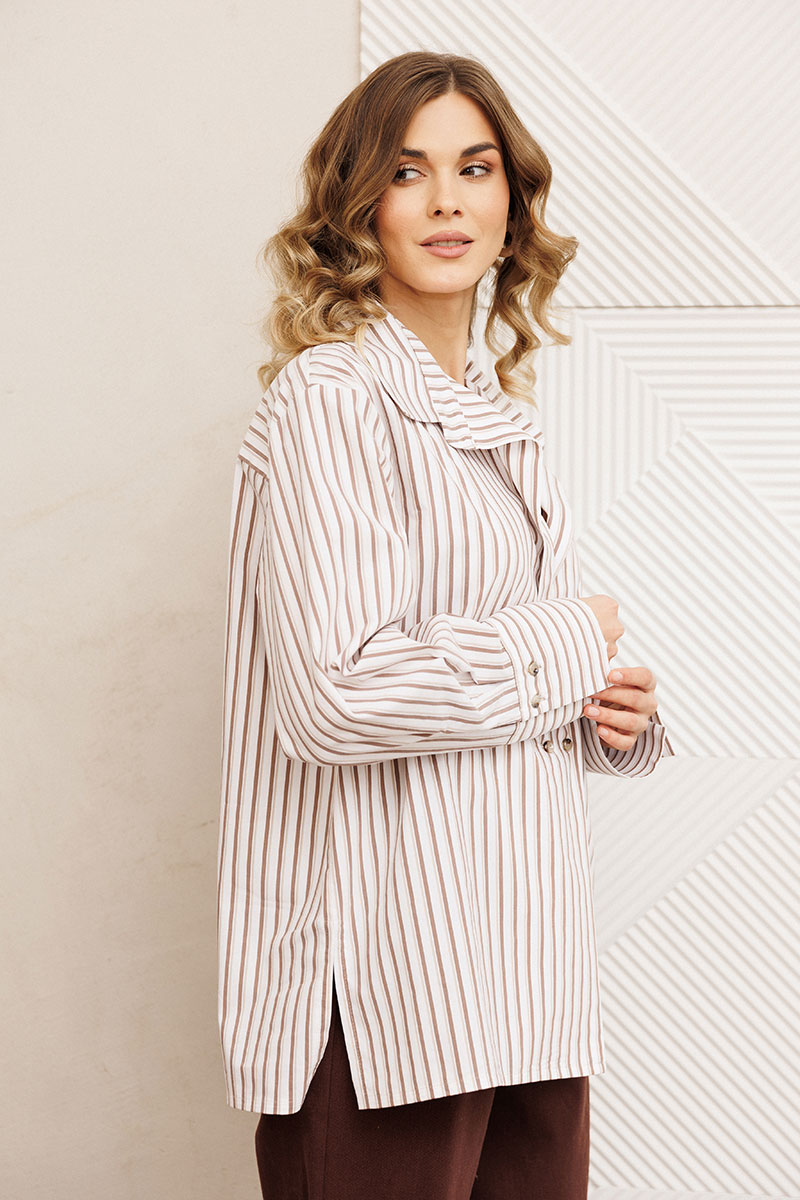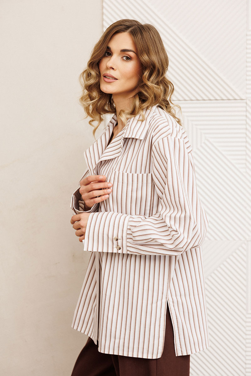 Рубашка свободного силуэта из хлопковой ткани в полоску. Перед с двубортной застежкой и карманом в районе груди. Воротник со стойкой. Спинка с кокеткой и складкой. Рукав втачной рубашечный с высокой манжетой на 2 петли и пуговицы.