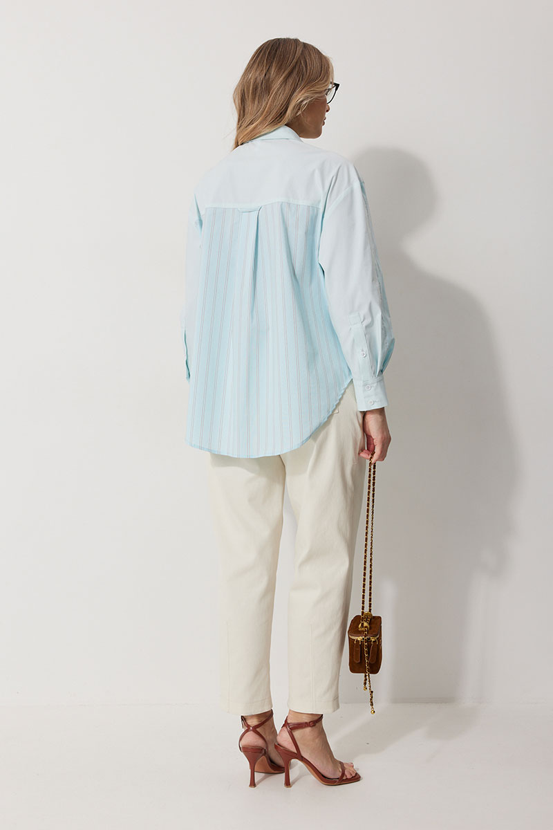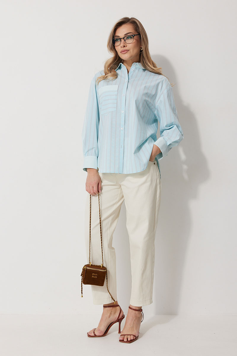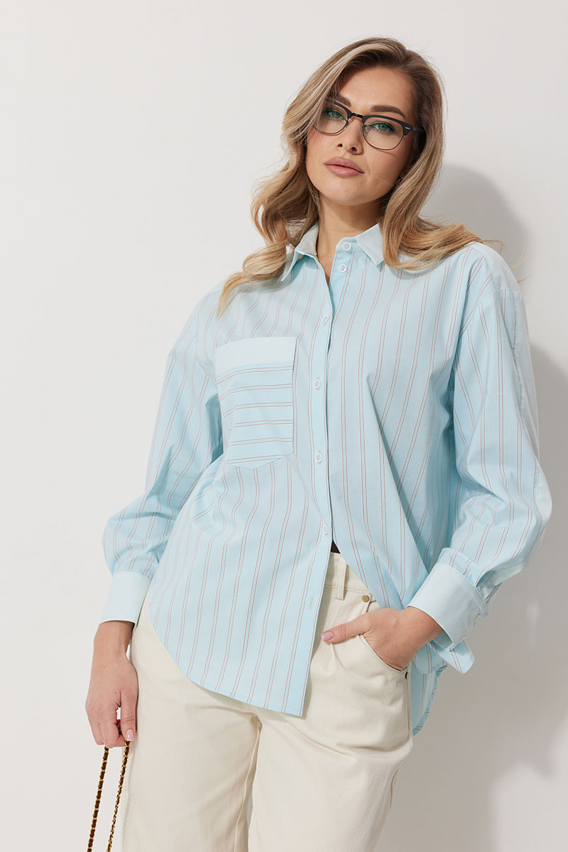 Блузка женская прямого силуэта. Полочки из ткани в полоску.  На правой полочке настрочен накладной карман с комбинацией тканей. Перед обработан цельнокроеными планками с центральной застежкой на петли и пуговицы. Спинка из ткани в полоски с кокеткой из ткани компаньона. По верхней части спинки  заложена бантовая складка. Плечо спущено. Рукав длинный, двухшовный. Одна часть рукава из ткани в полоску, другая из ткани компаньона. Рукав по низу со складкой, обработан широкой притачной манжетой  застегивающейся на петли и пуговицы. Разрез рукава обработан притачными отрезными планками. Манжета и притачные планки из ткани компаньона. Низ разноуровневый, закругленной формы. Горловина обработана воротником рубашечного типа с отрезной стойкой из ткани компаньона.
