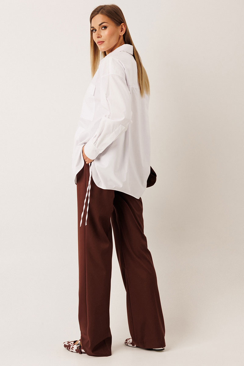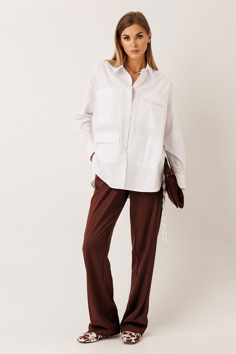 – по бокам — кулиса: шнурки можно затянуть и завязать, создавая новый силуэт рубашки