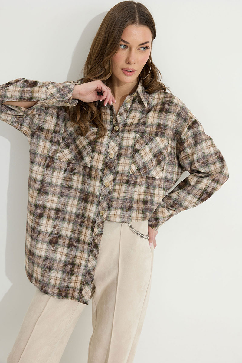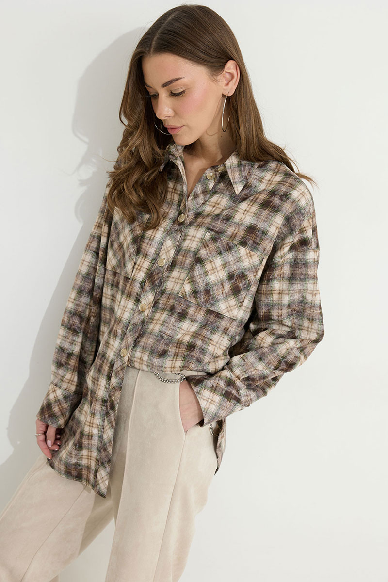 Блузка прямого силуэта из плательно-костюмной ткани с фигурным низом. Воротник стояче-отложной с отрезной стойкой, по центру застежка на петли и пуговицы. Рукав со спущенной линией плеча, по низу манжета с застежкой на петли и пуговицы. По переду накладные карманы. На спинке кокетка со складками. Обращаем ваше внимание, что фурнитура может отличаться от фото.