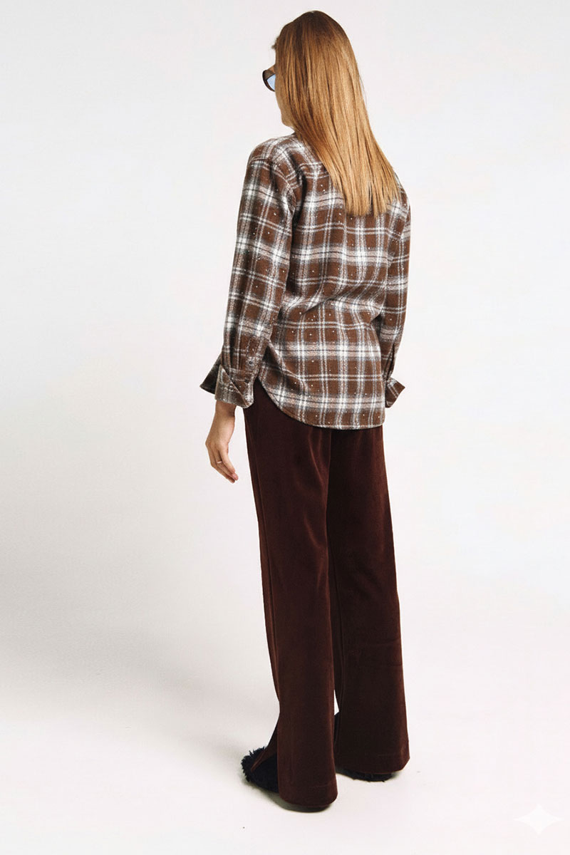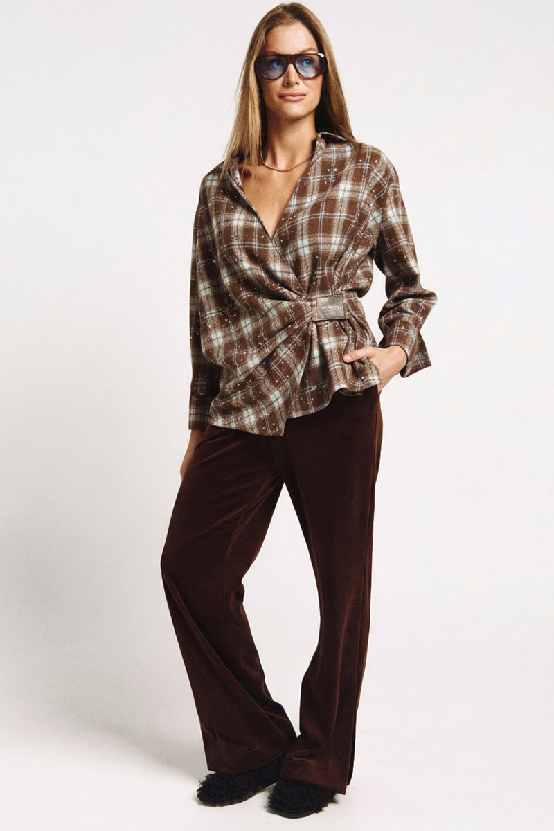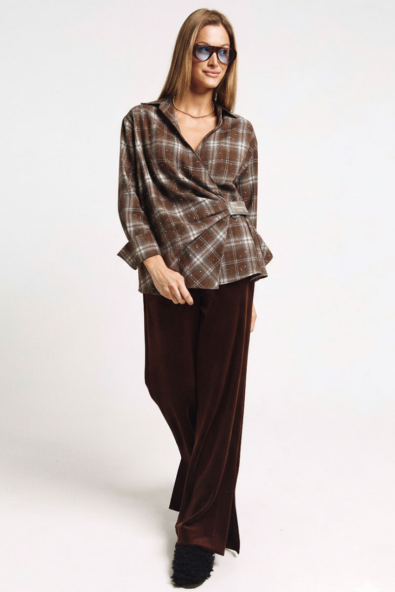 Рубашка из мягкой хлопковой фланели со стразами с асимметричной застежкой на "липучке", и декоративными складками. Свободный силуэт.