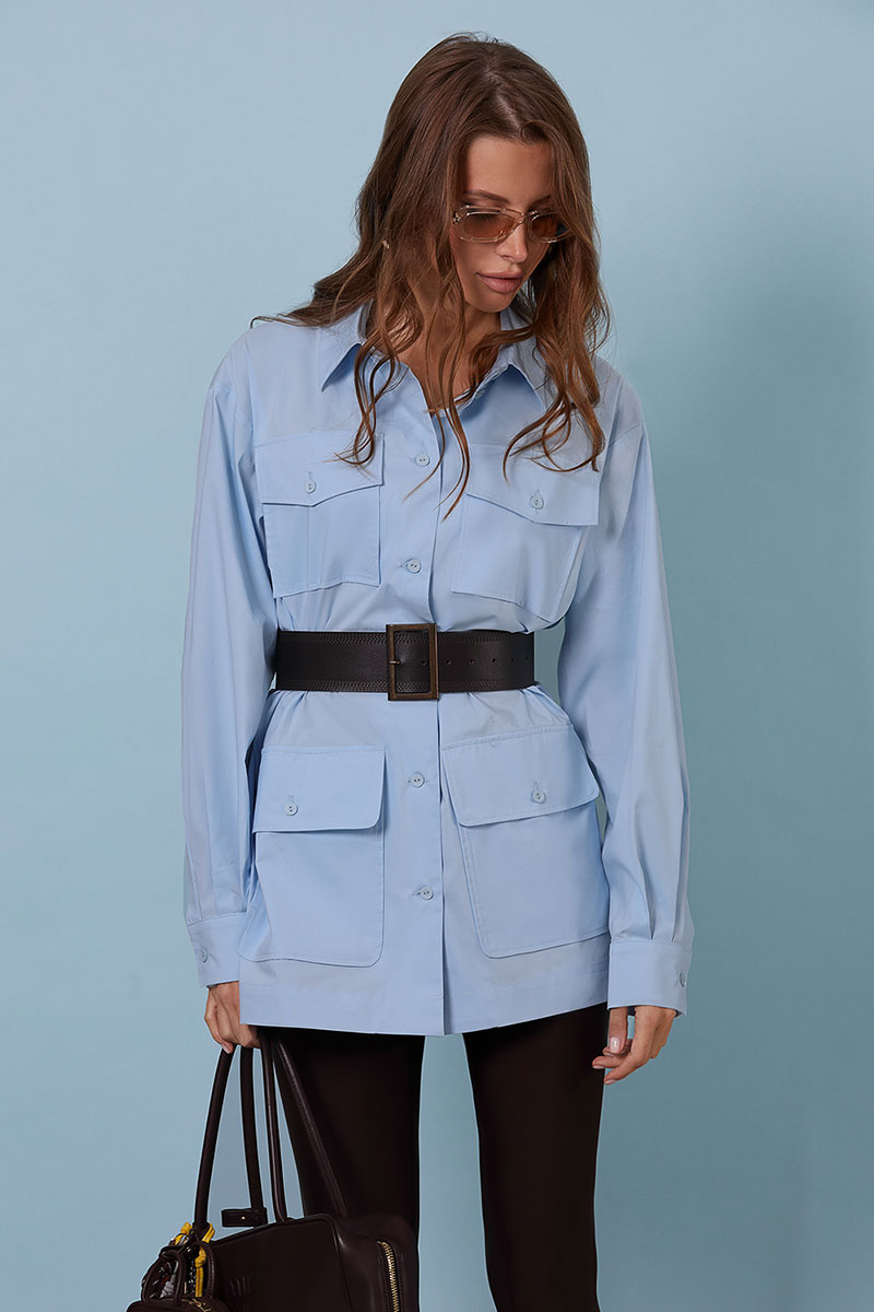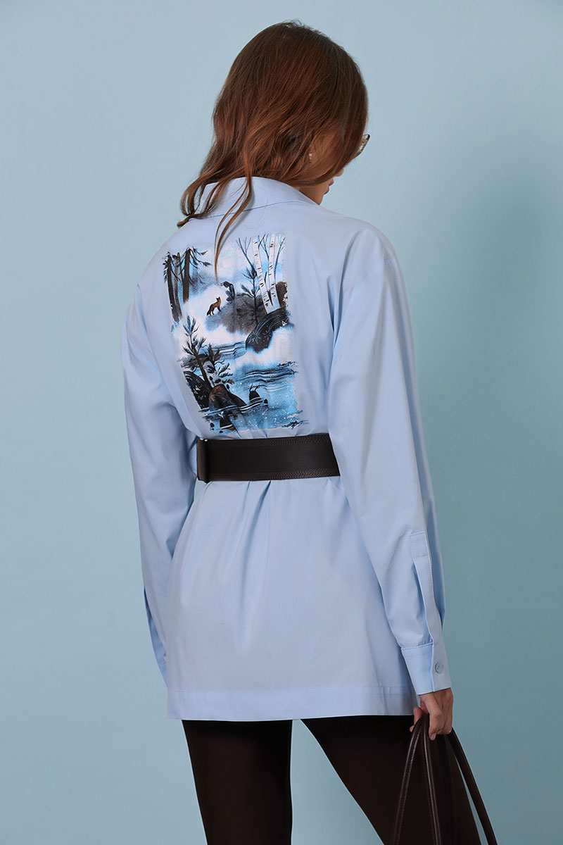 Рубашка прямого силуэта, длиной ниже бедра, выполнена в стиле милитари. Центральная застежка доверху на петли и пуговицы. Накладные фигурные карманы с клапанами на полочках изделия. Спущенная линия плеча, объемный рубашечный рукав. Рукав снизу на притачной манжете. Спинка прямая. На спине авторский принт “КАРЕЛИЯ”. Рубашечный воротник на стойке.