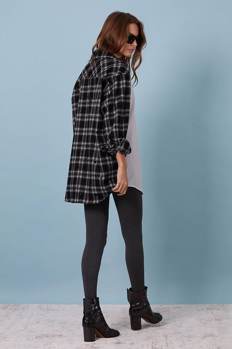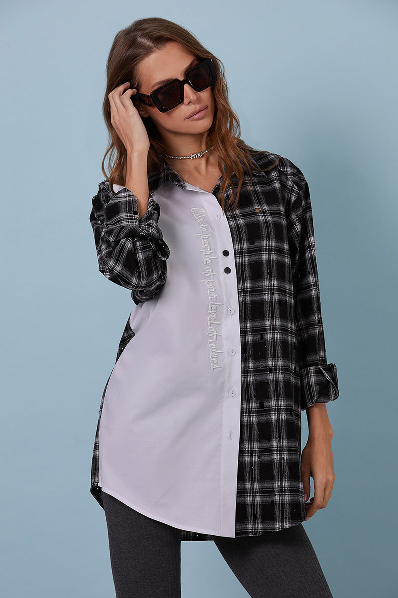 Рубашка прямого силуэта, длиной ниже бедра. Центральная застежка доверху на петли и пуговицы. Спущенная линия плеча, объемный рубашечный рукав. Рукав снизу на притачной манжете. Спинка с отрезной кокеткой и бантовой складкой. Рубашечный воротник на стойке. Низ ассиметричный. Правая полочка выполнена из отделочной ткани. По краю борта авторская вышивка в тон ткани.