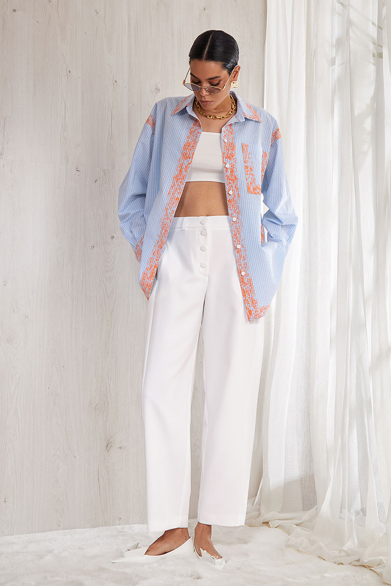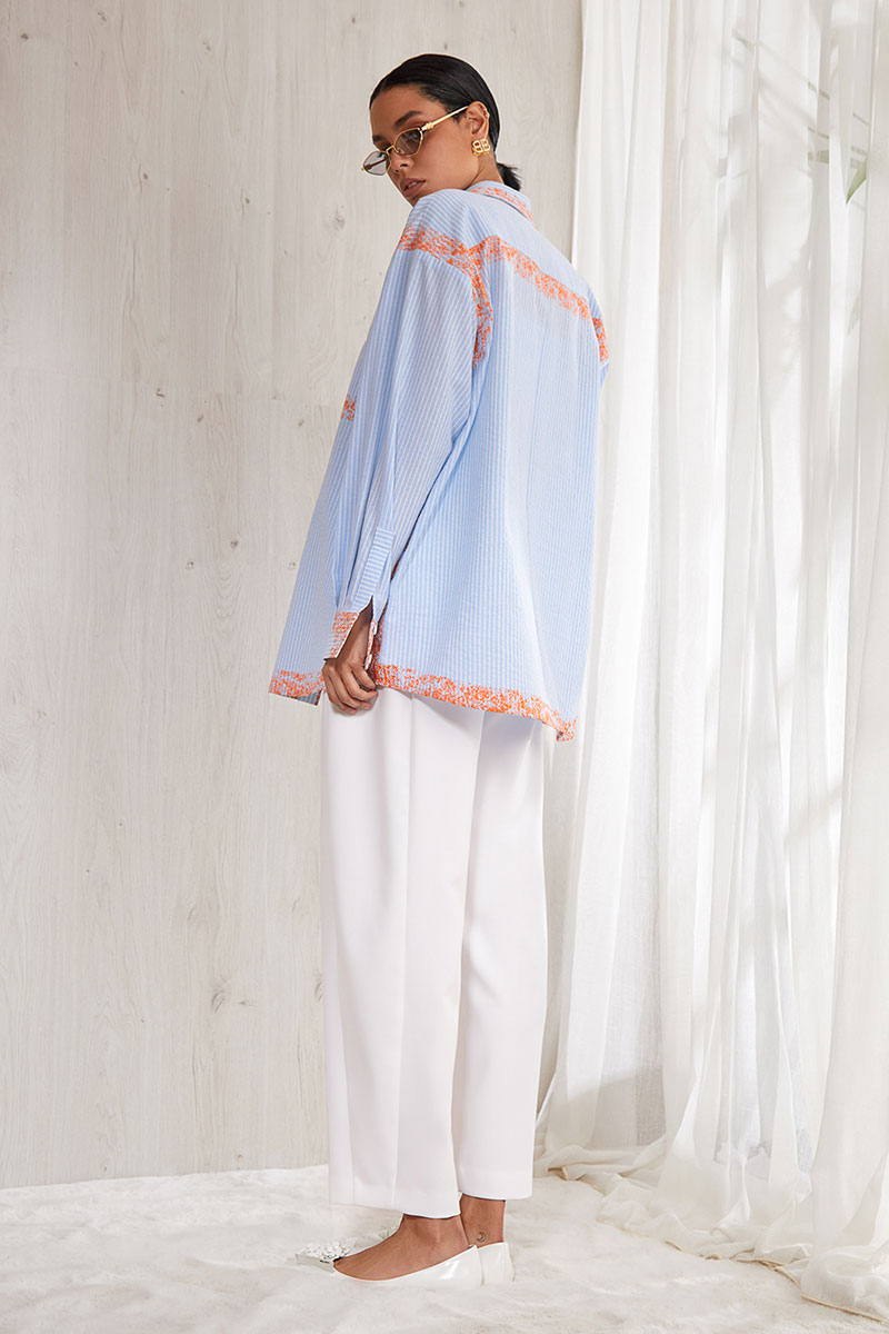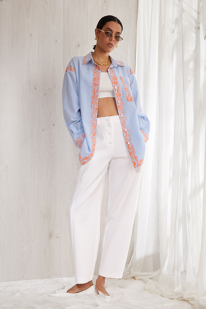 Рубашка прямого силуэта длиной ниже середины бедра.. Центральная застежка доверху на петли и пуговицы. Накладной карман на левой полочке изделия. Спущенная линия плеча, объемный рубашечный рукав. Рукав на притачной манжете. Спинка с отрезной кокеткой. Рубашечный воротник на стойке. Авторский принт по всем частям изделия.