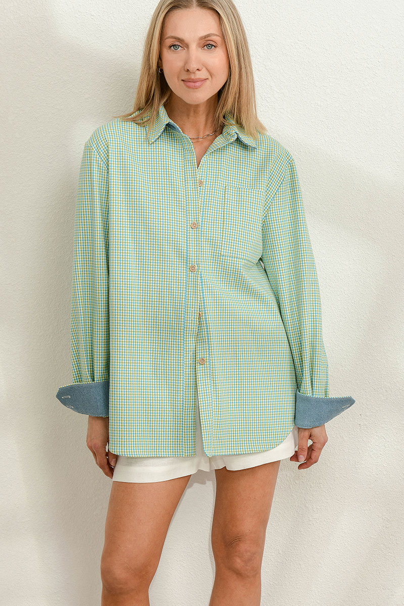 Уютная рубашка в клетку для тех, кто ценит яркие образы. Плотный и приятный к коже итальянский хлопок хорошо держит форму и мало сминается . На воротнике и манжетах добавлены элементы из денима. Рубашку можно носить как второй слой, комбинируя с боди или водолазками.