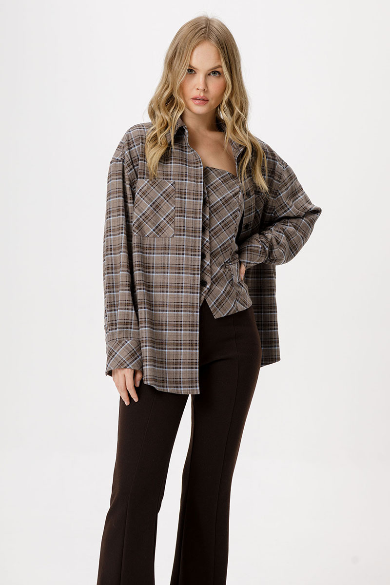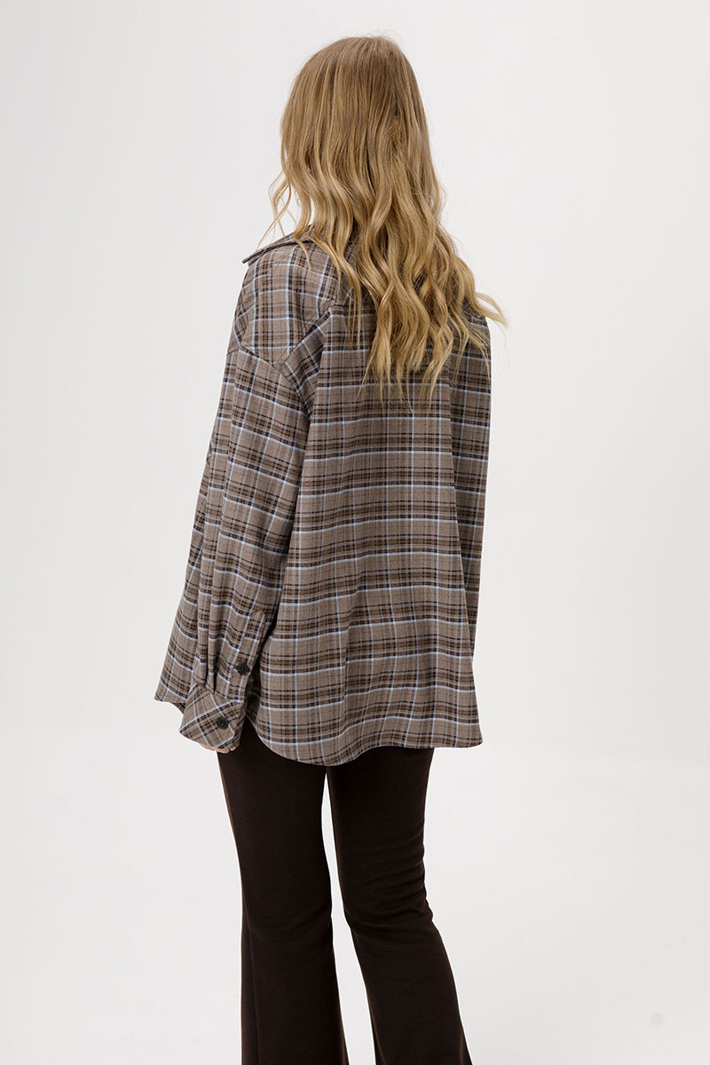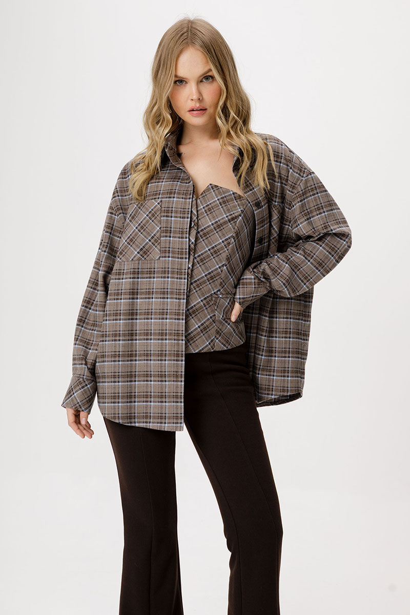 Детали: прямой силуэт, свободный покрой, рубашечный воротник, застежка на петли и пуговицы, перед с накладными карманами, спинка с кокеткой, рукава длинные с манжетами.
