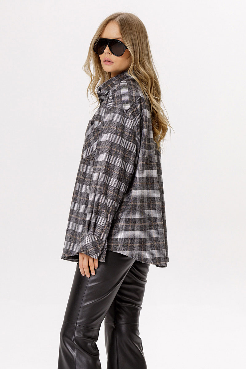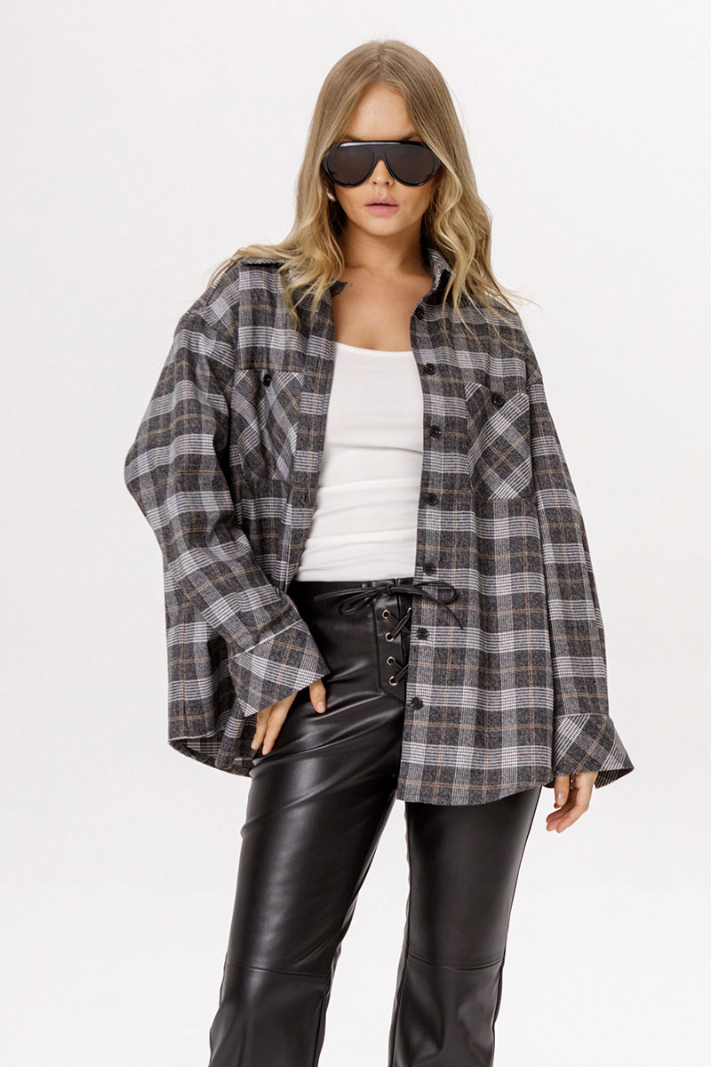 Детали: прямой силуэт, свободный покрой, рубашечный воротник, застежка на петли и пуговицы, перед с накладными карманами, спинка с кокеткой, рукава длинные с манжетами.