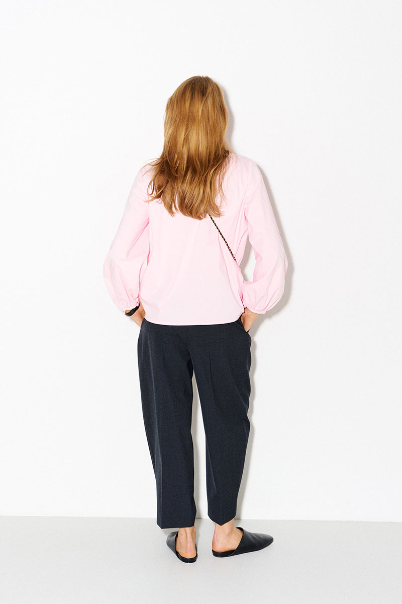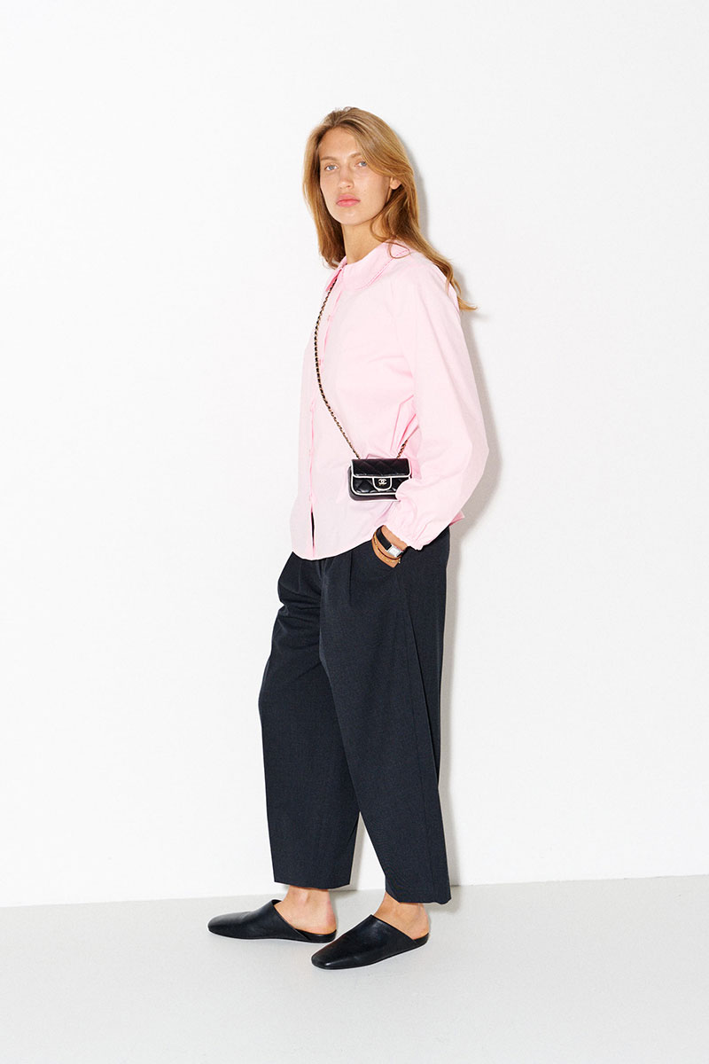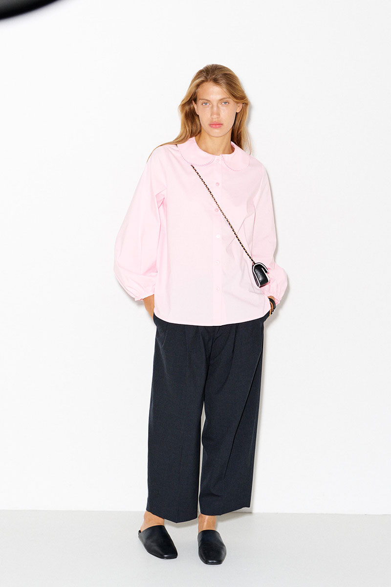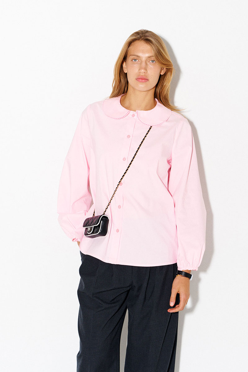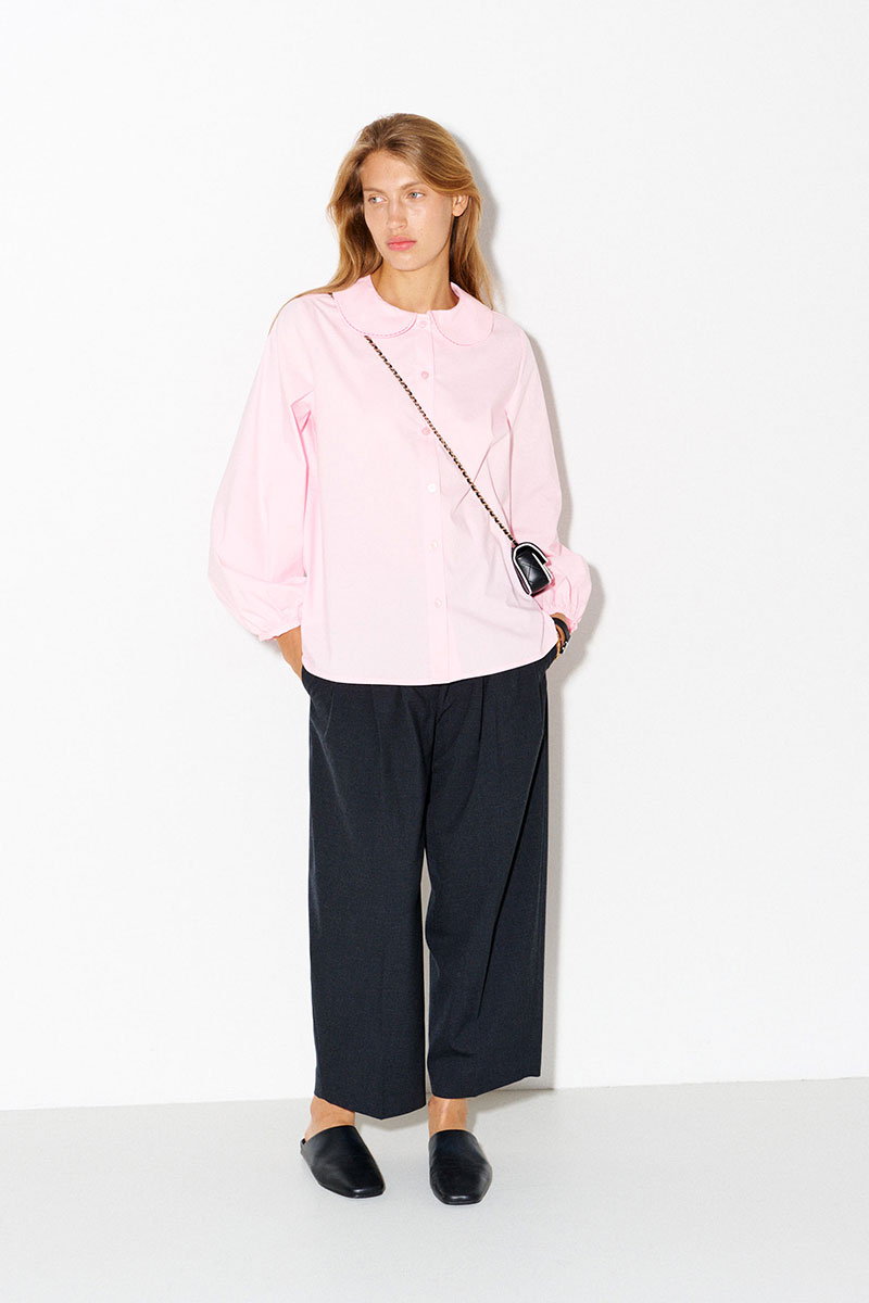 Розовая хлопковая рубашка с вышивкой по воротнику в цвет ткани. Воротник округлой формы, объемные рукава, умеренный свободный силуэт.