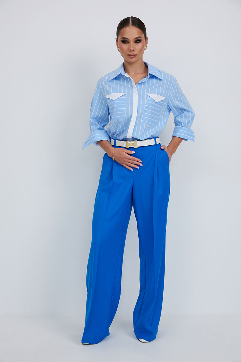 Блузка женская свободного силуэта, из рубашечной ткани в полоску. Спинка с кокеткой и складкой. Скрытая застежка на петли и пуговицы, по переду накладные карманы с элементом из отделочной ткани, рукав свободный, по низу манжета с пуговицами. Воротник рубашечный со стойкой.