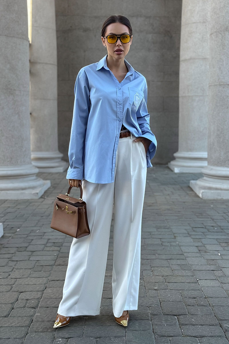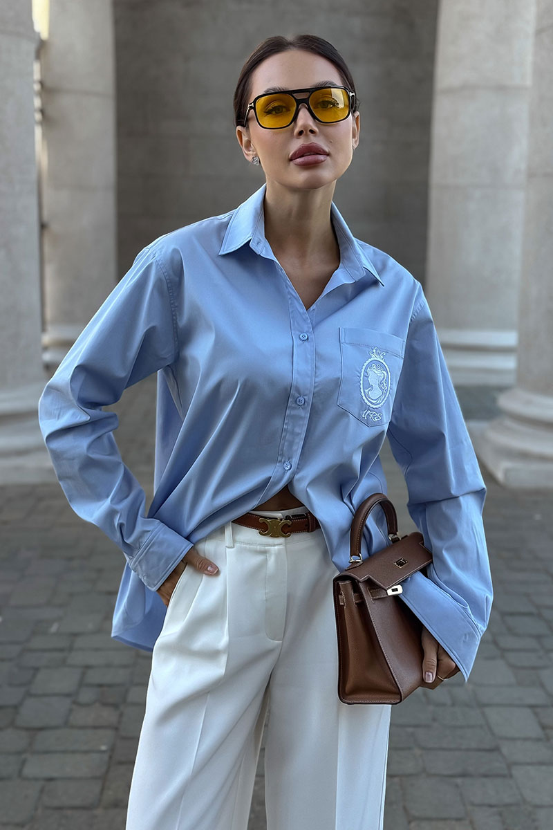 Стильная рубашка с вышивкой придаст вашему образу нежности и женственности. Блузка женская свободного силуэта, со спущенной линией плеча, выполнена из блузочной ткани, с центральной бортовой застежкой на 6 петель и пуговиц (размер и цвет фурнитуры может незначительно отличаться от фото).