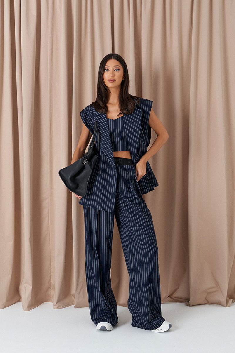 Брюки прямого свободного кроя. Выполнены из костюмной ткани синего цвета с полоской голубого цвета. Пояс на резинке чёрного цвета (брендированной). От пояса складки. По передней части заутюженные стрелки. Имитация застёжки. Наклонные карманы из боковых швов. Брюки дополнят топ А2277, жилет А5495.