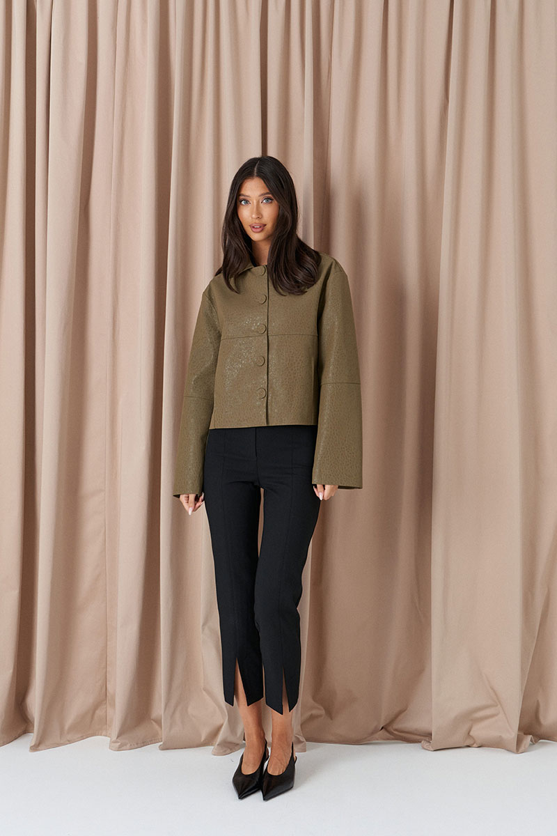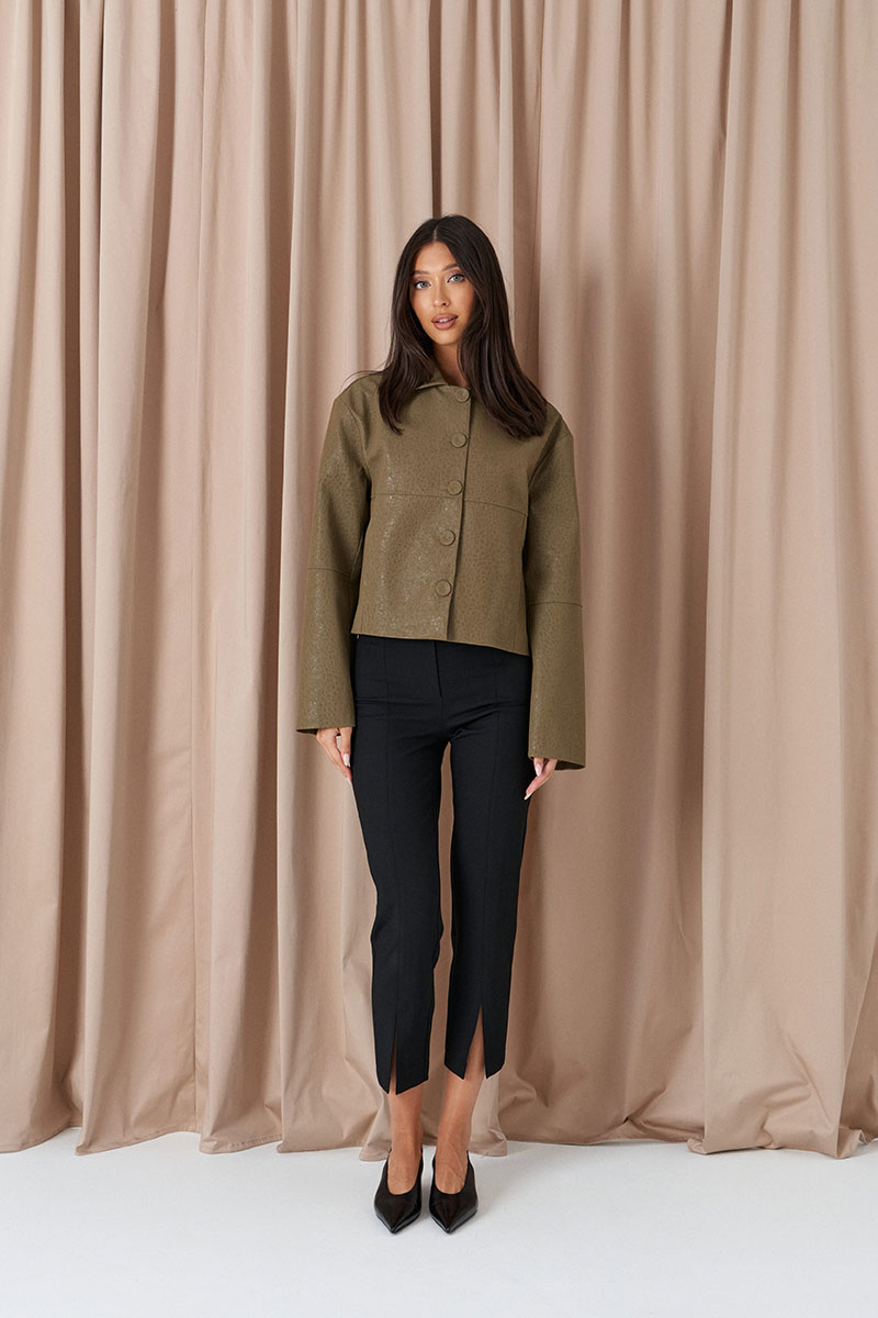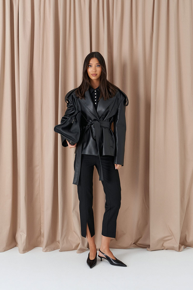 Брюки прилегающего кроя, выполнены из костюмной ткани черног цвета. Характеристики: прилегающий крой, пояс стабильный застежка на молнии с пуговицей, на задней части изделия имитация карманов, передней и задней части брюк застроченные стрелки, в стрелках передней части разрезы. по низу изделия эластичные штрипки.