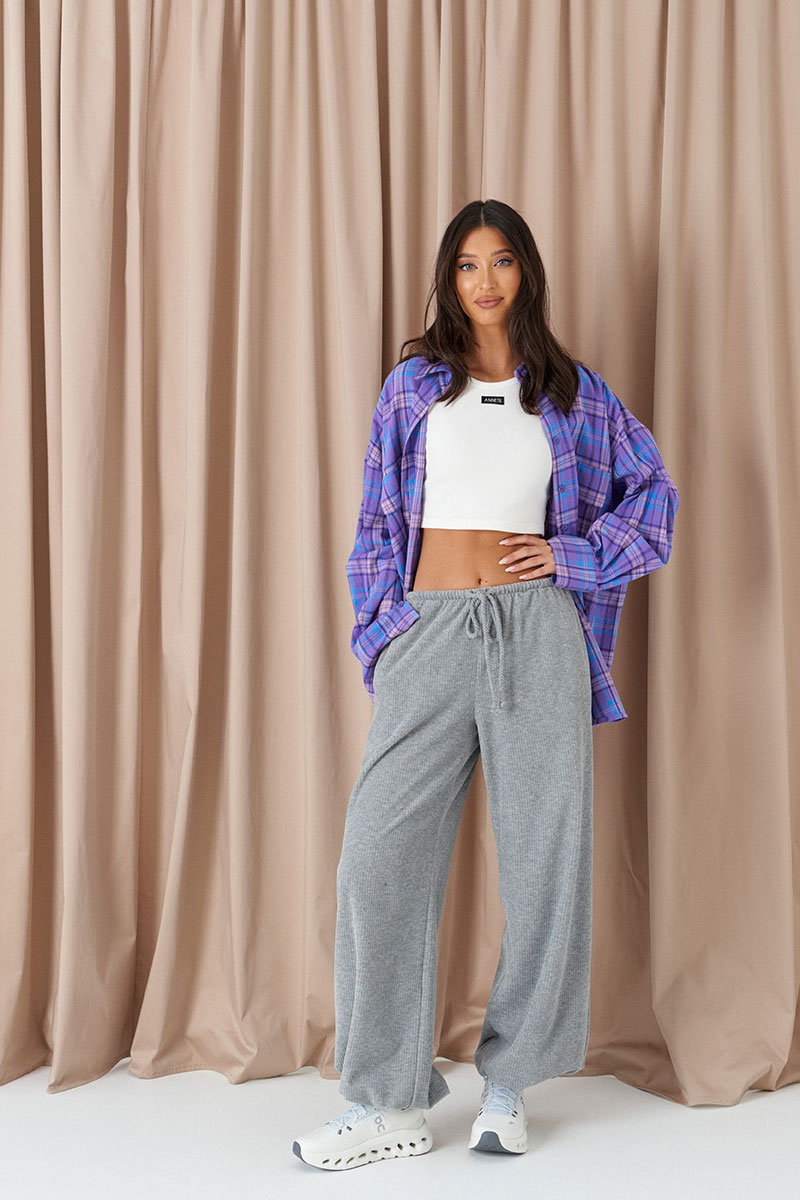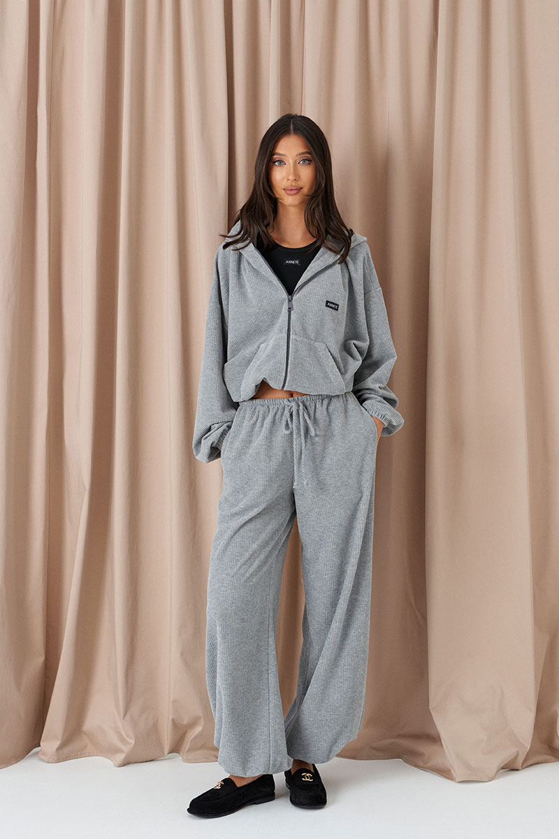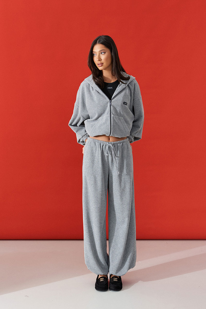 Брюки-джоггеры. Выполнены из полотна штрукса серого цвета. Характеристики: прямой крой, пояс на резинке с кулиской, в боковых швах карманы, накладные карманы на задней части брюк, штанина внизу на резинке с фиксатором.