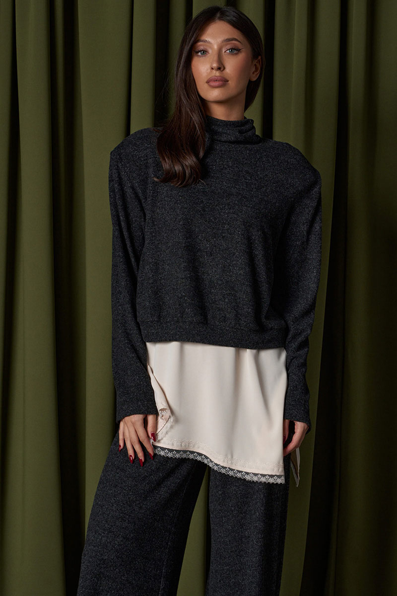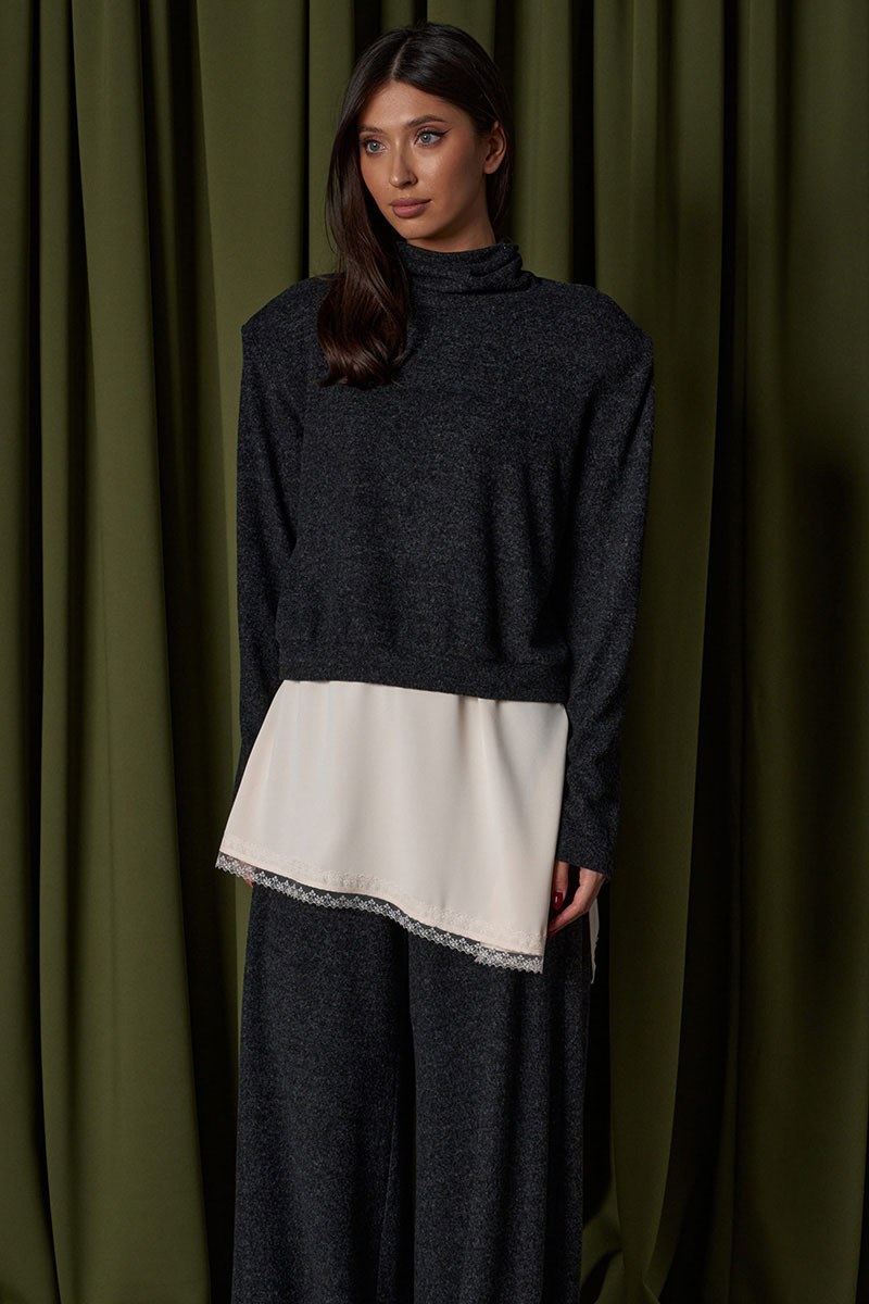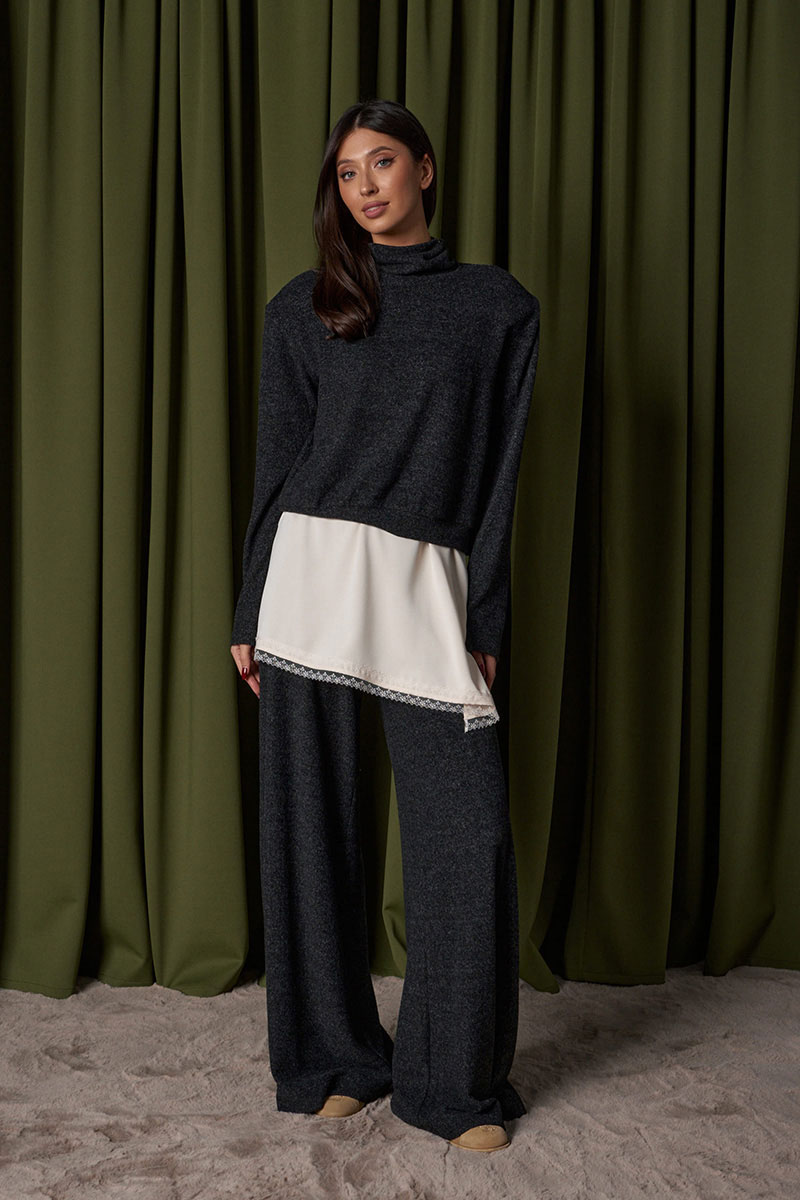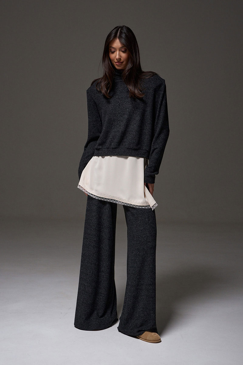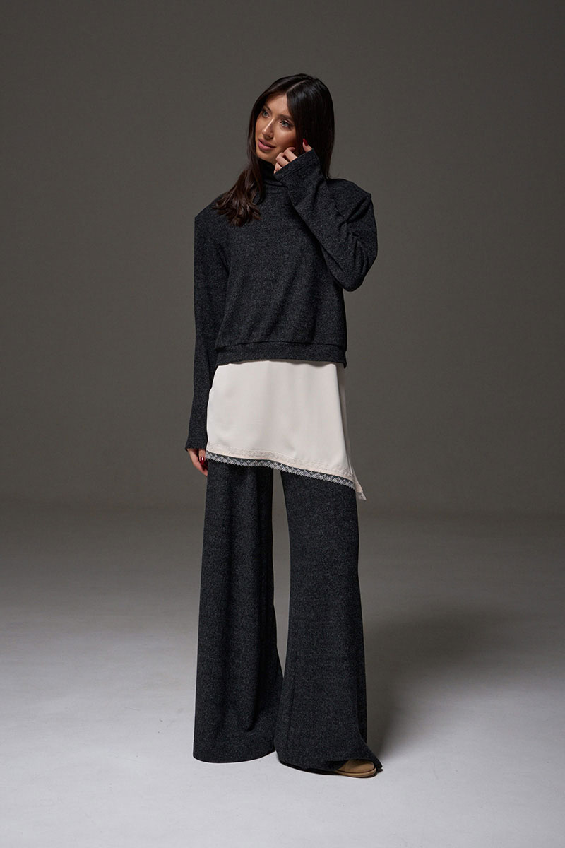 Брюки прямого кроя, выполнены из трикотажного ворсистого полотна графитового цвета. Характеристики: прямой крой, пояс на резинке на подгибе.
