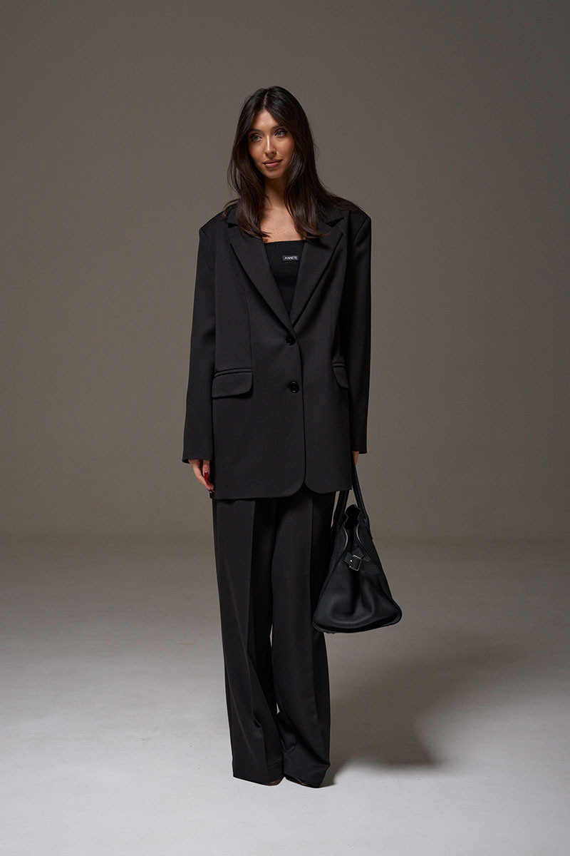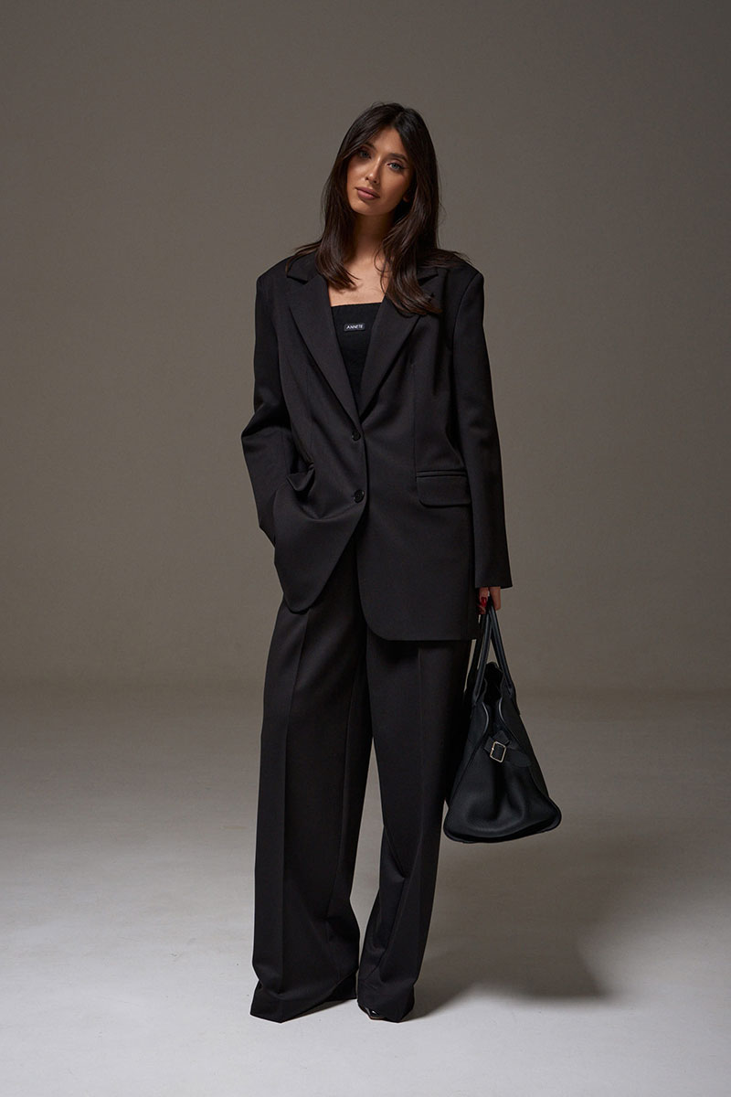 Брюки прямого кроя, выполнены из костюмной ткани черного цвета. В боковых швах карманы с отрезным бочком. Пояс на резинке. По переду изделия имитация застёжки с пришитыми пуговицами. По передней и задней части брюк заутюженные стрелки.