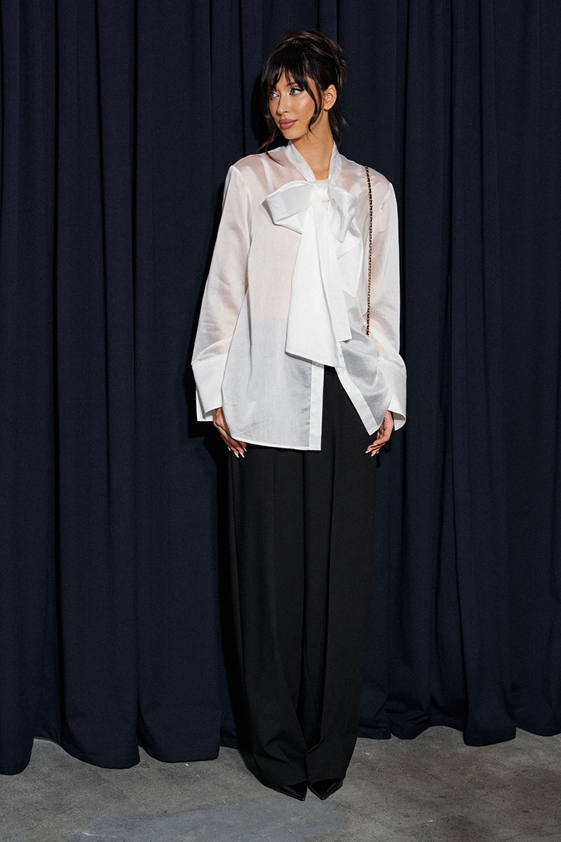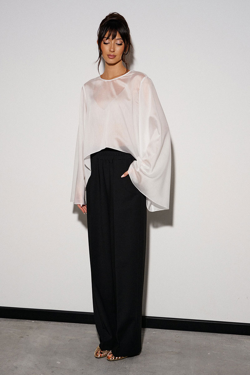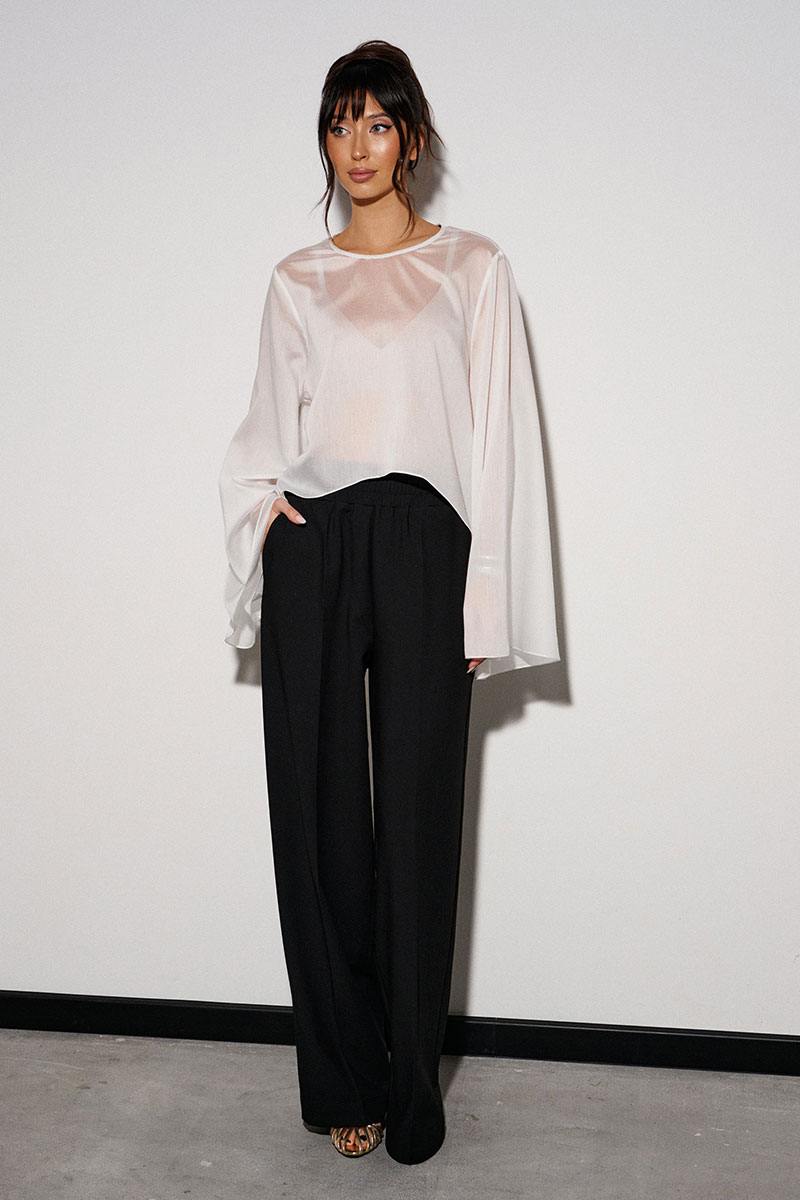 Брюки прямого кроя выполнены из костюмной ткани черного цвета. Характеристики: прямой крой, широкая резинка 7 см из основной ткани, боковые карманы, на передних и задних частях брюк заутюжены стрелки.