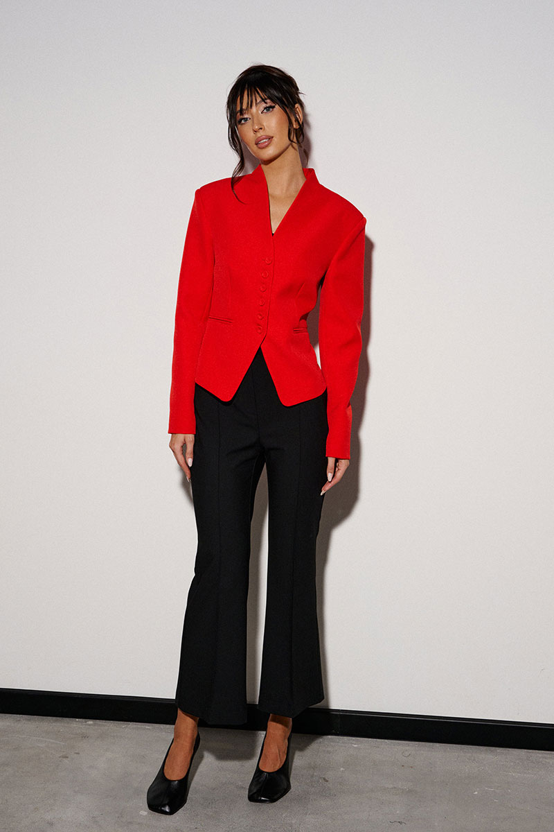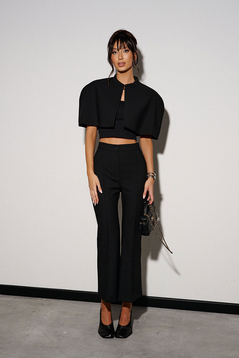 Брюки-клёш укороченные. Выполнены из костюмной ткани чёрного цвета. Пояс стабильный. Застежка центральная - молния и пуговица. По передней и задней часть стрелки (застроченные). В боковых шва имитация карманов. По задней части брюк имитация карманов в виде карманной листочки.