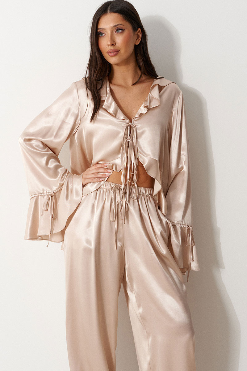 Брюки-джоггеры, выполнены из мягкого струящегося полотна телесного цвета. Характеристики: прямой крой, пояс на резинке, в боковых швах карманы, штанина внизу на резинке с фиксатором.