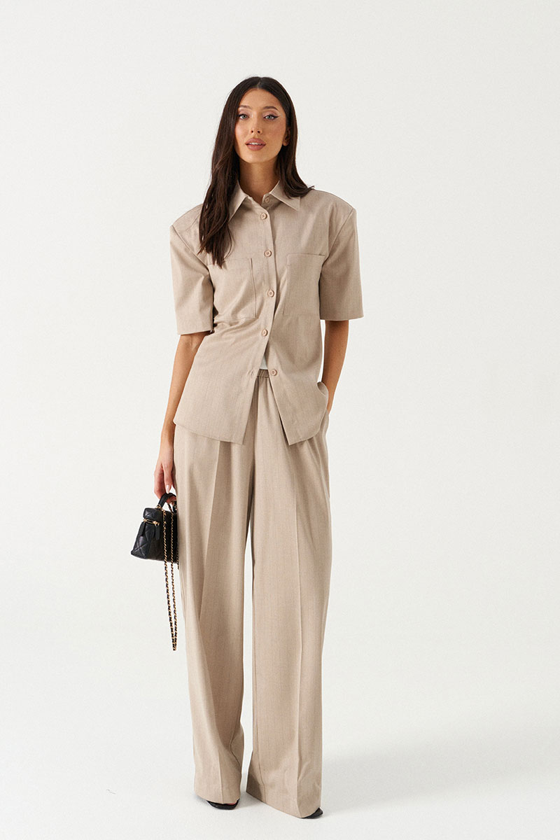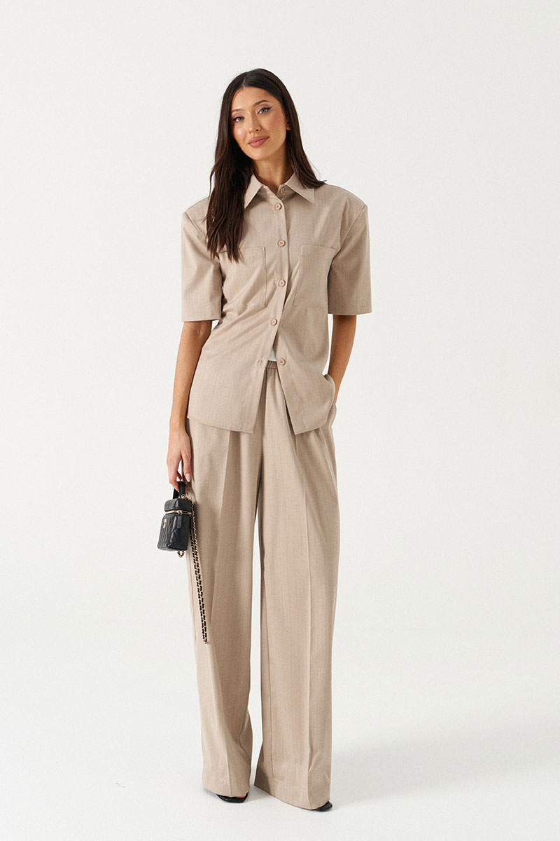 Брюки прямого кроя выполнены из текстильной тонкой ткани бежевого цвета в узкую полоску. Характеристики: прямой крой, пояс на широкой резинке, боковые карманы, на передних и задних частях брюк заутюжены стрелки, без подкладки.