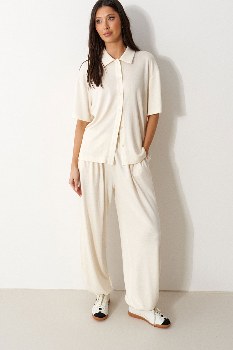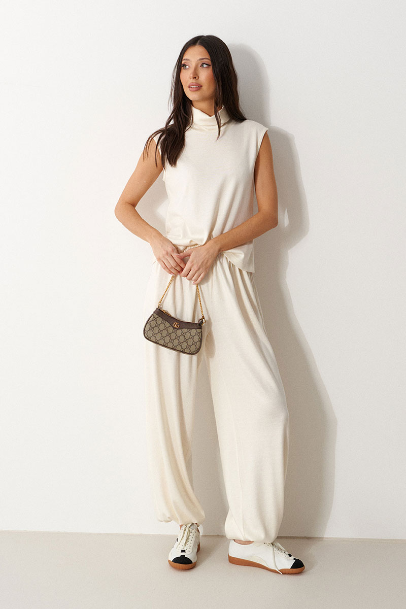 Брюки-джоггеры выполнены из трикотажного полотна молочного цвета. Характеристики: прямой крой, пояс на шнурке-резинке с фиксатором, в боковых швах карманы, штанина внизу на резинке с фиксатором.