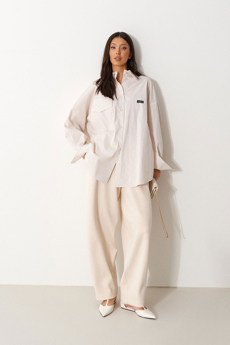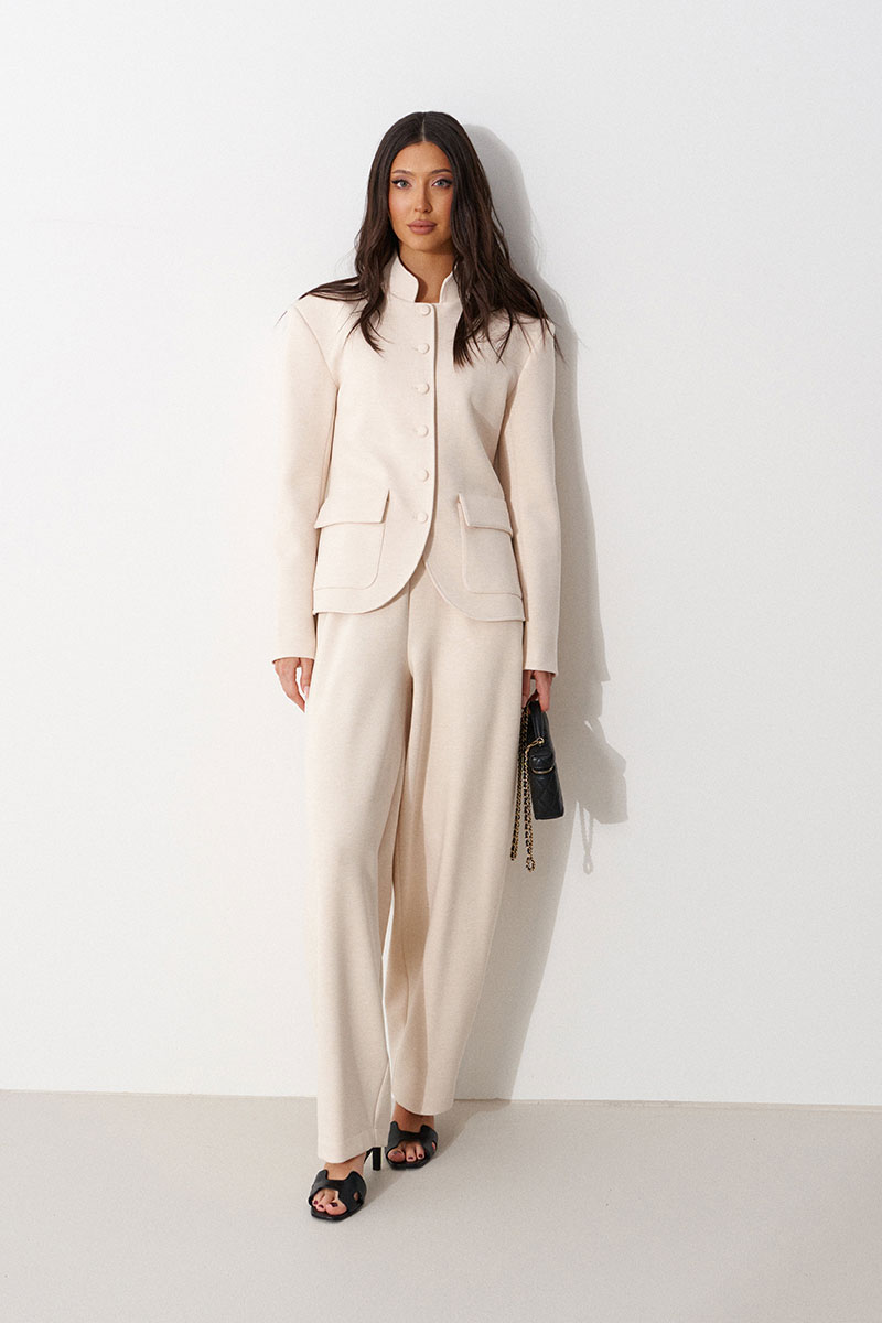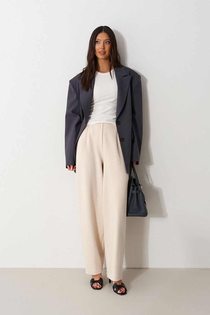Брюки свободного кроя. Выполнены из плотного трикотажа бежевого цвета. Без подкладки. Пояс на резинке. В боковых швах карманы. По задней части накладные карманы. Брюки заужены к низу.