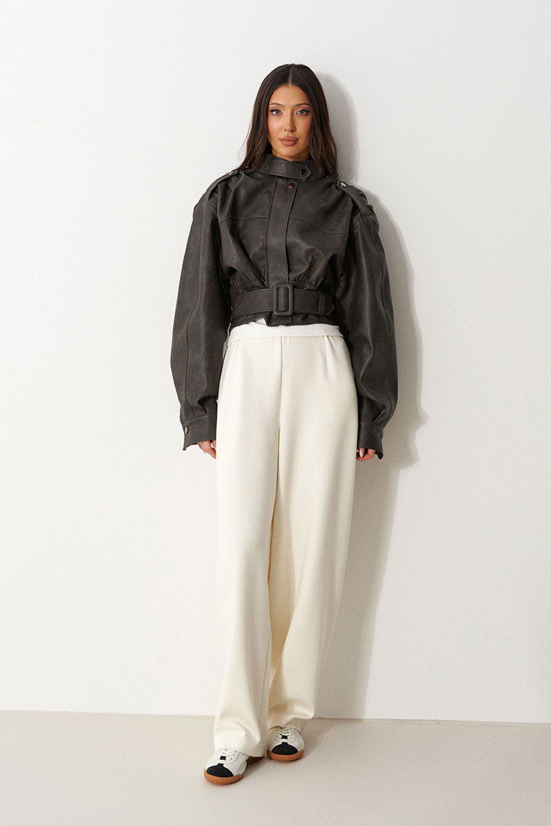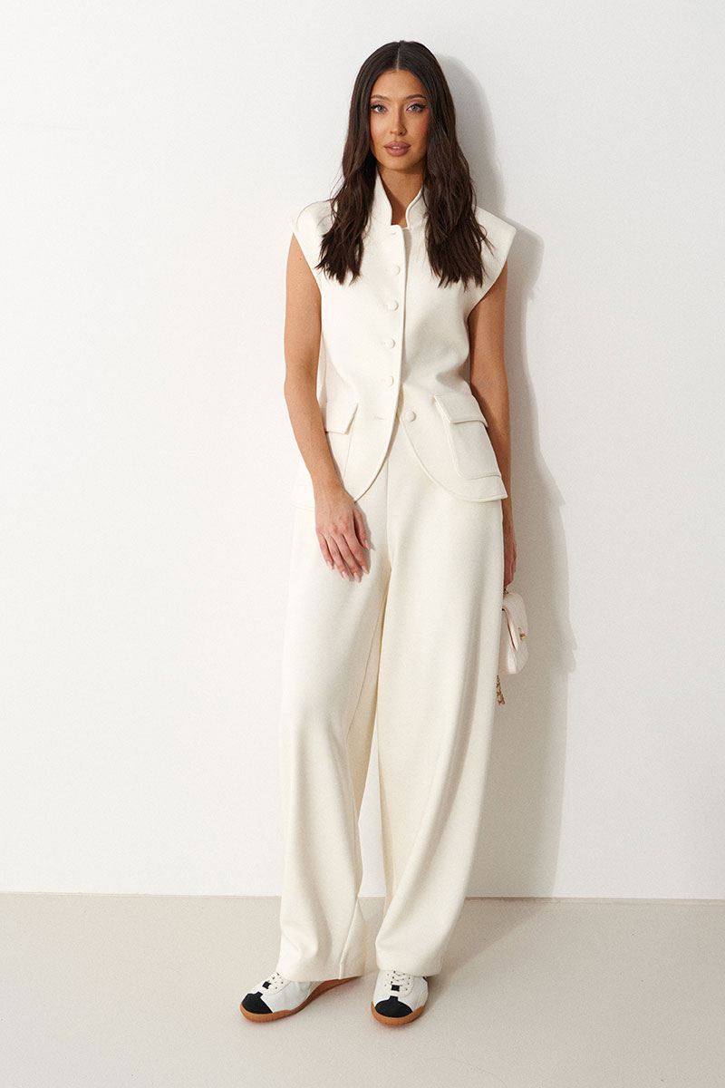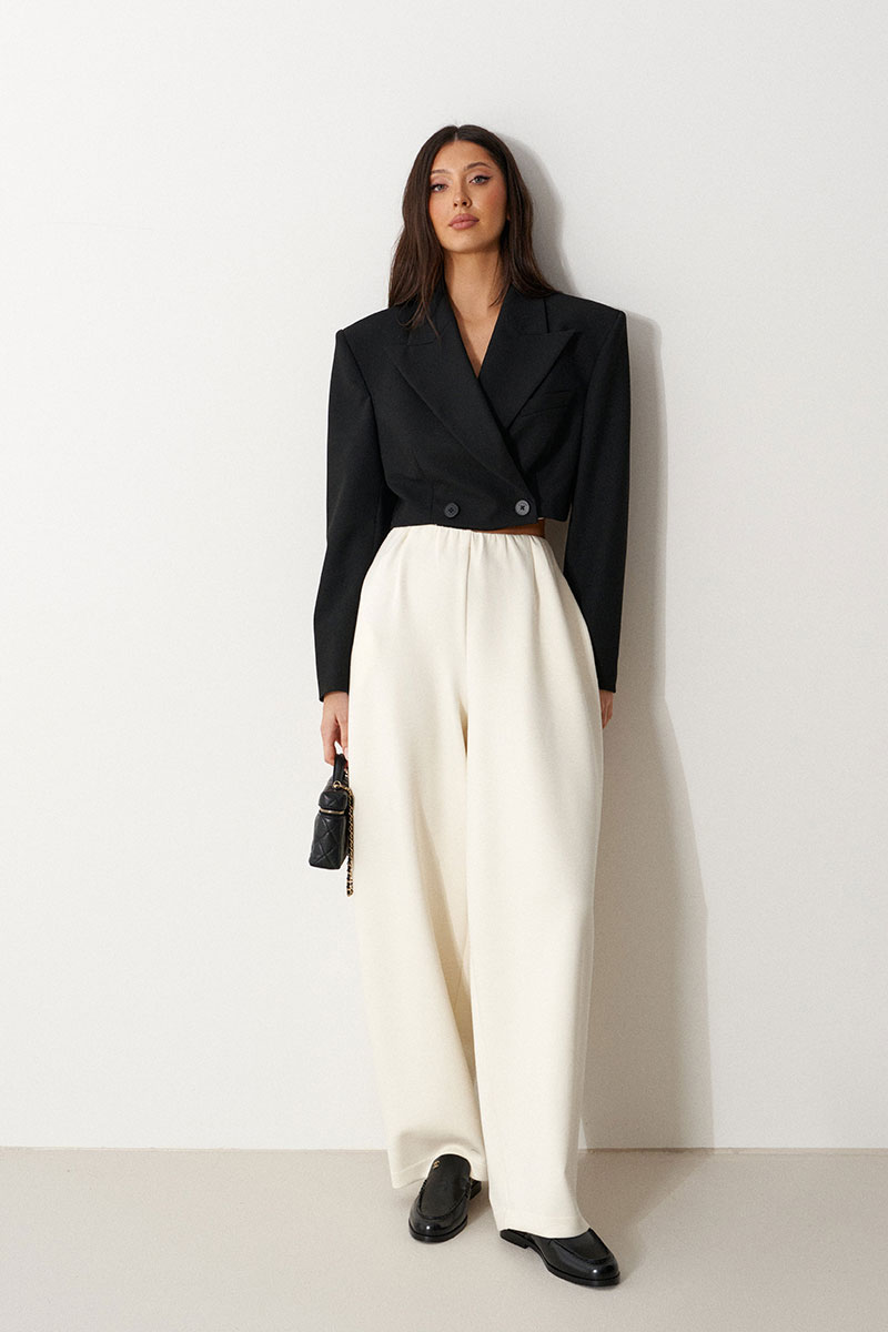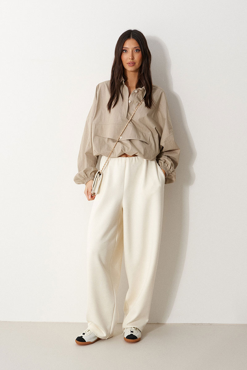 Брюки свободного кроя. Выполнены из плотного трикотажа молочного (тёпло-белого) цвета. Без подкладки. Пояс на резинке. В боковых швах карманы. По задней части накладные карманы. Брюки заужены к низу.