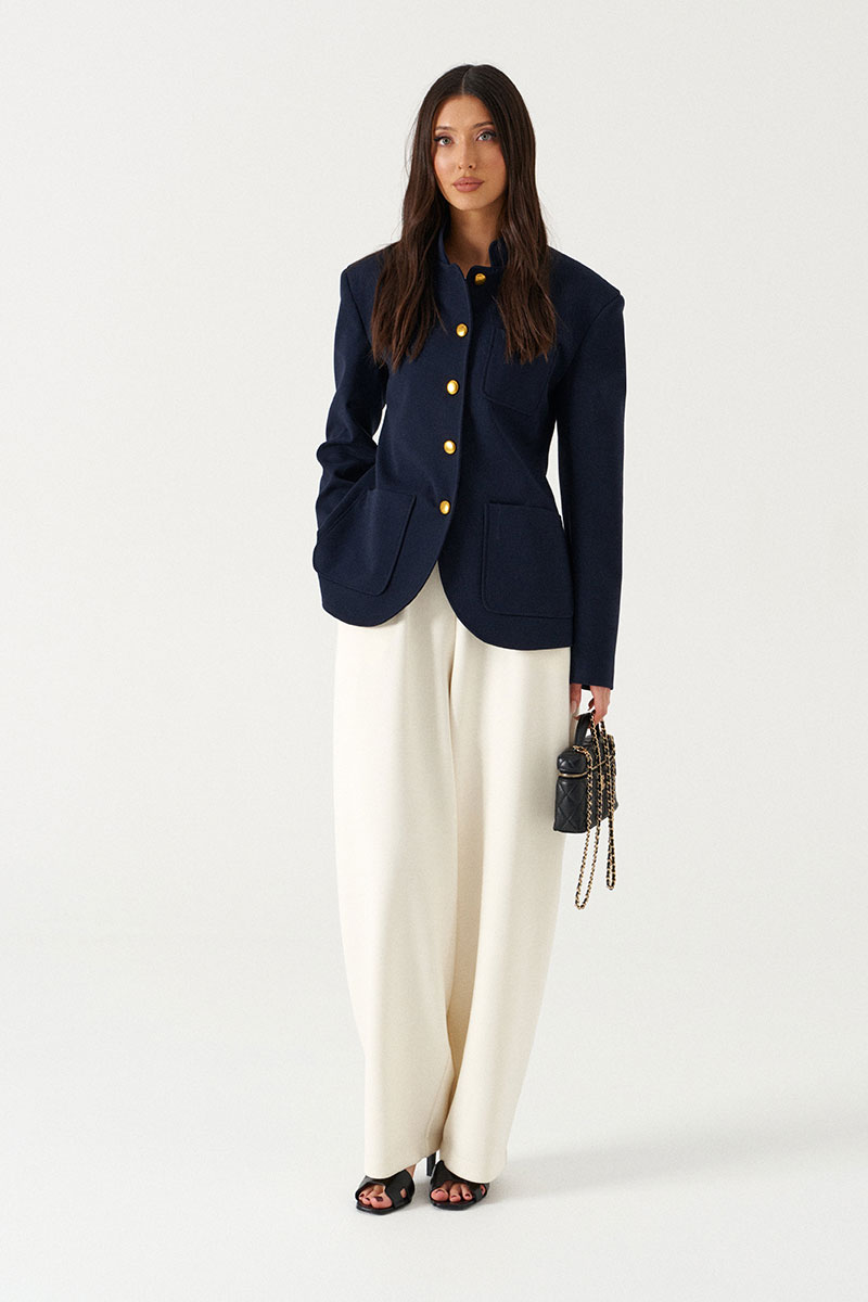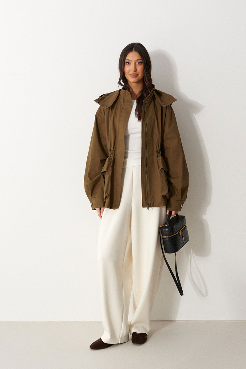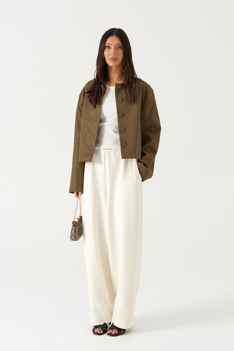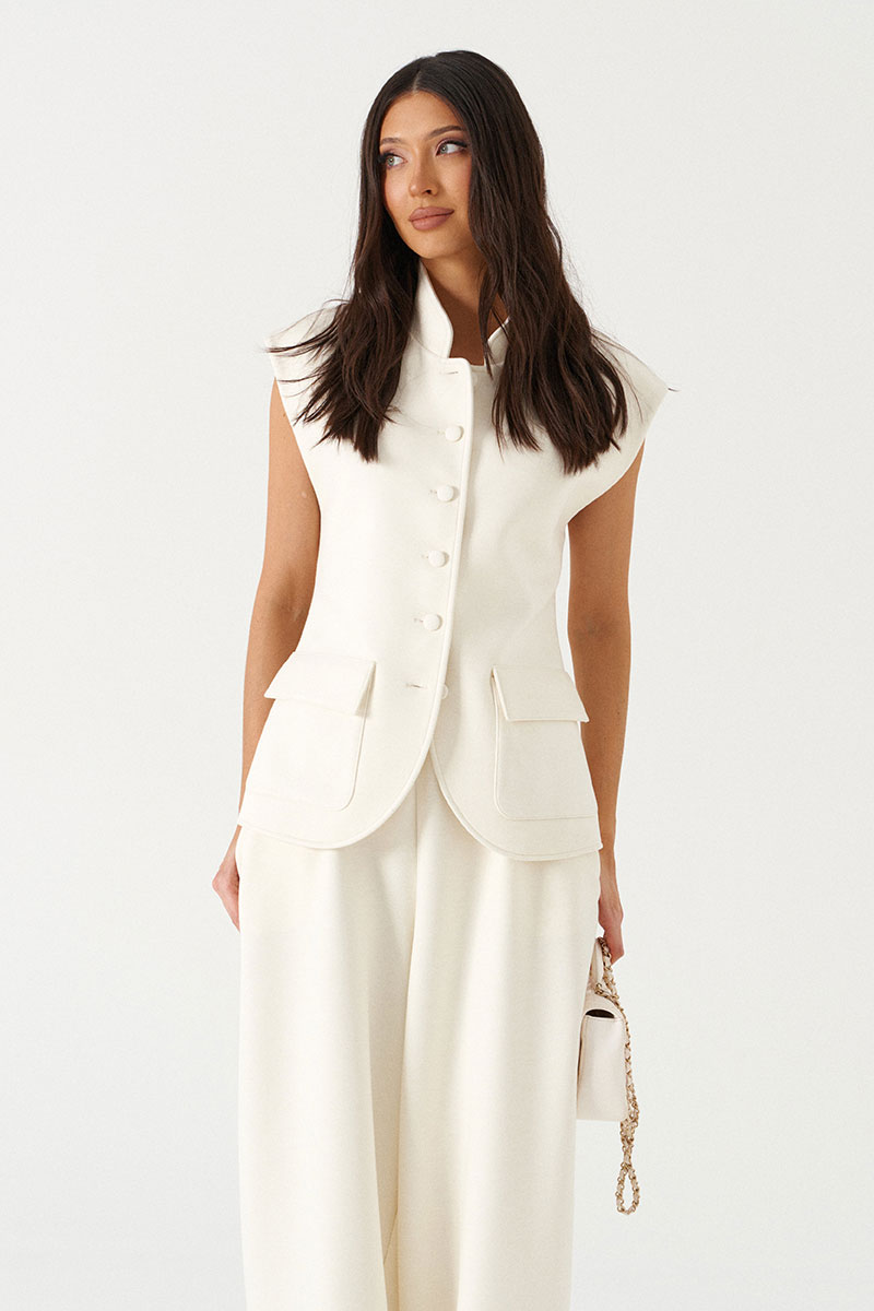 Брюки свободного кроя. Выполнены из плотного трикотажа молочного (тёпло-белого) цвета. Без подкладки. Пояс на резинке. В боковых швах карманы. По задней части накладные карманы. Брюки заужены к низу.