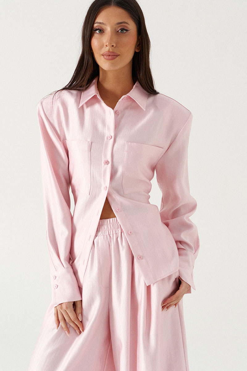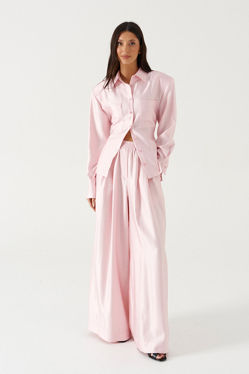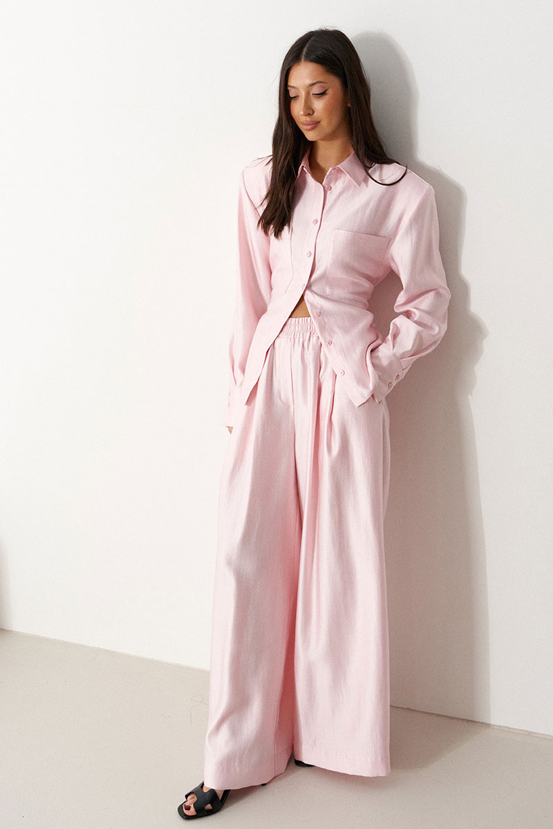 Брюки прямого свободного кроя. Выполнены из текстильного полотна нежно-розового цвета с мягким блеском. Без подкладки. Пояс на резинке. По переду имитация застёжки. Наклонные карманы.