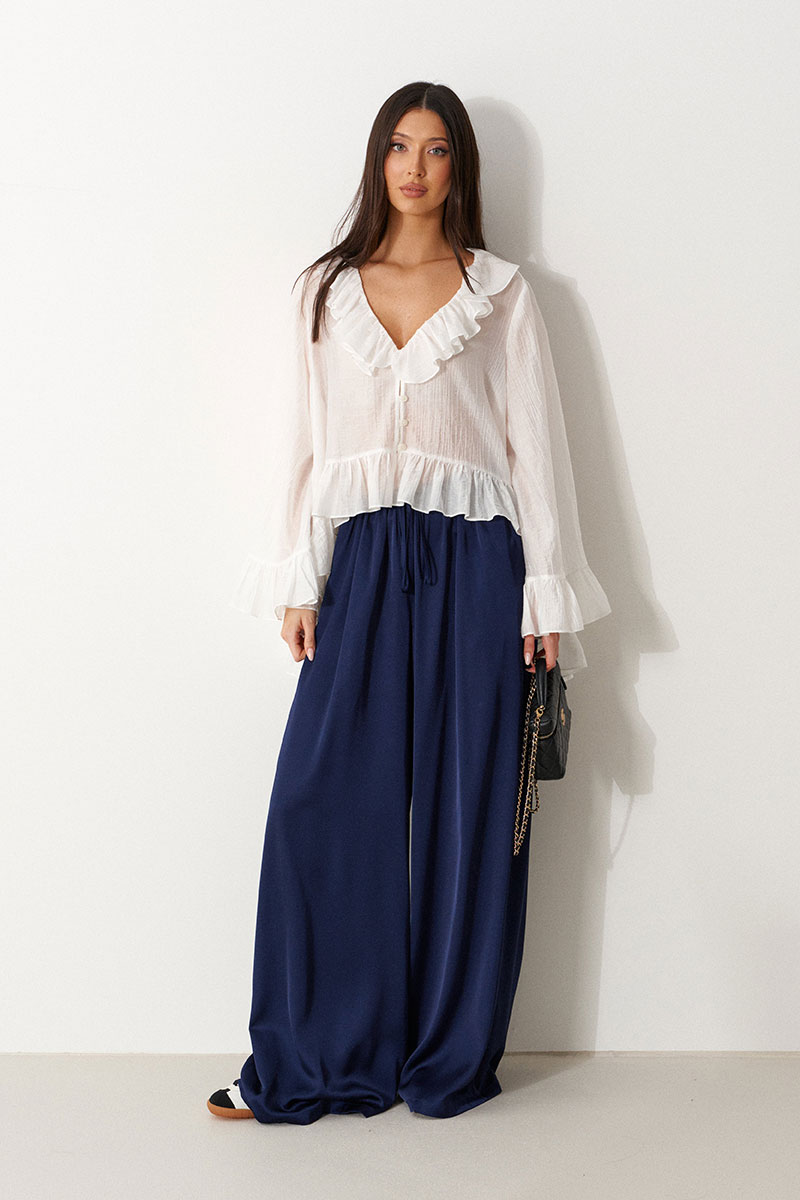 Брюки свободного кроя. Выполнены из мягкой струящейся ткани синего цвета. Пояс на резинке, со шнурочком. В боковых швах карманы.