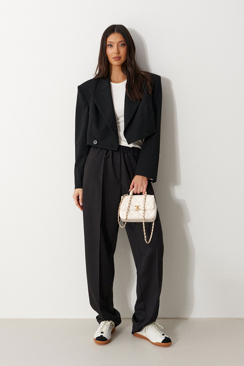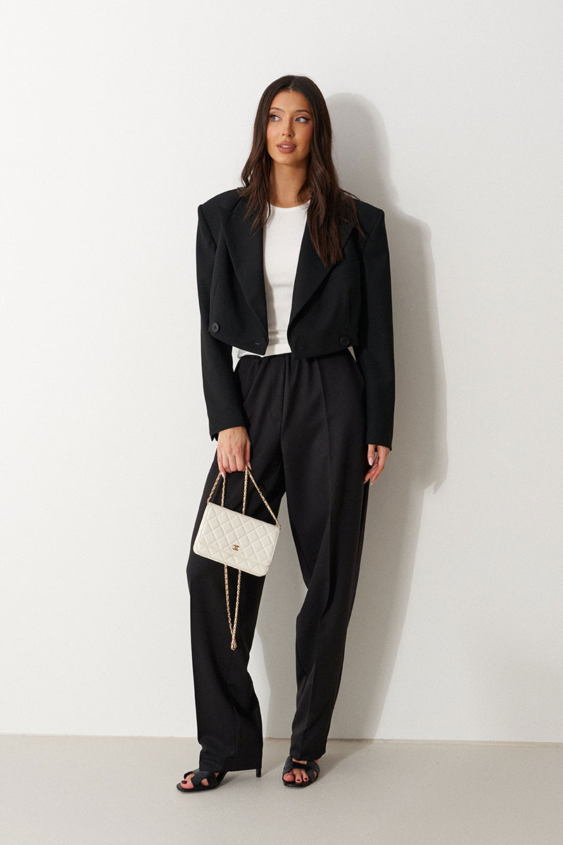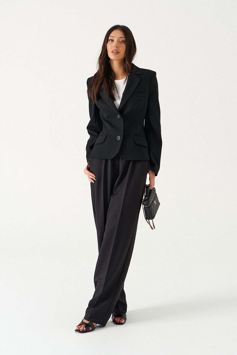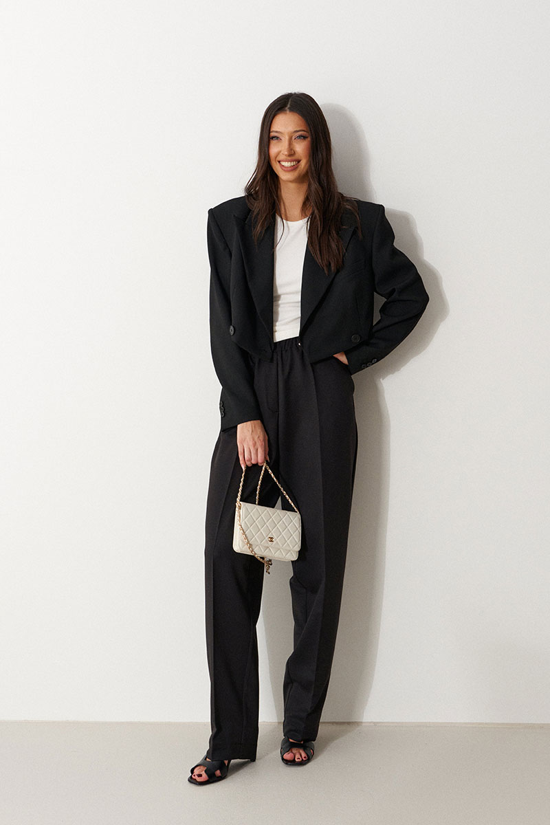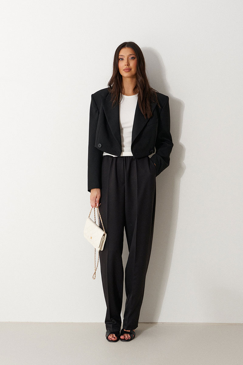 Брюки прямого свободного кроя, выполнены из костюмной тонкой ткани черного цвета. Характеристика: прямой крой, пояс на резинке, в боковых швах карманы, имитация гульфика, заутюженные стреки спереди и сзади, чуть заужаются к низу.