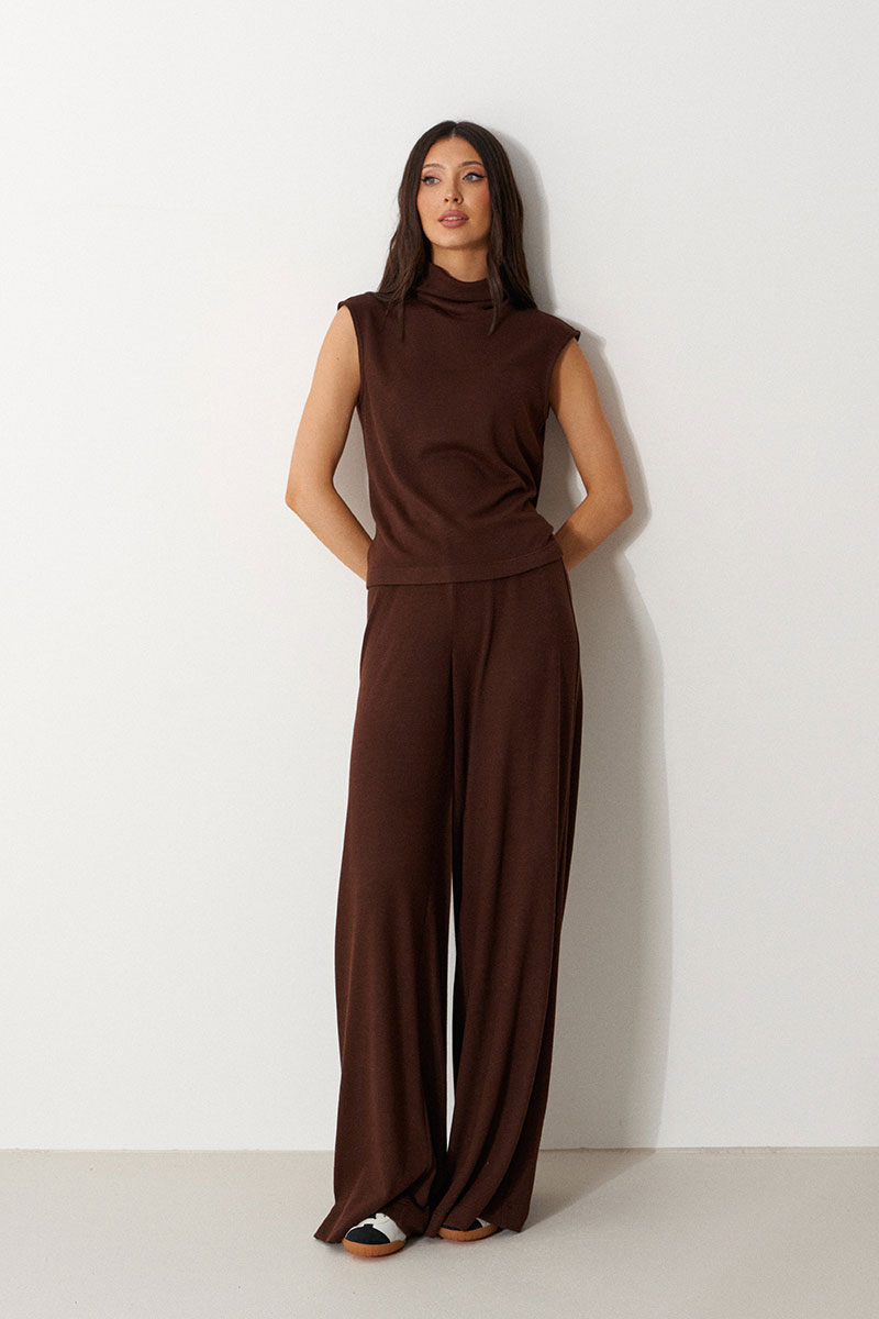 Брюки свободного кроя. Выполнены из мягкого трикотажа коричневого цвета. Пояс на резинке Застёжки нет, карманов нет.