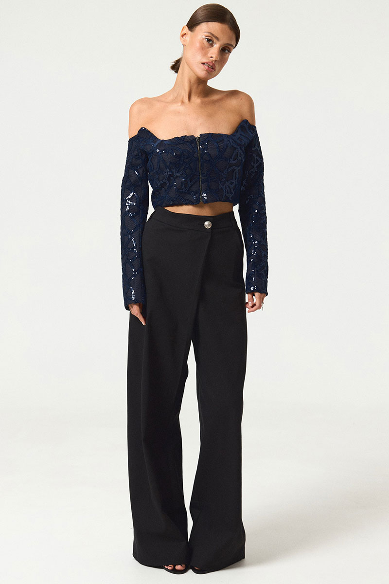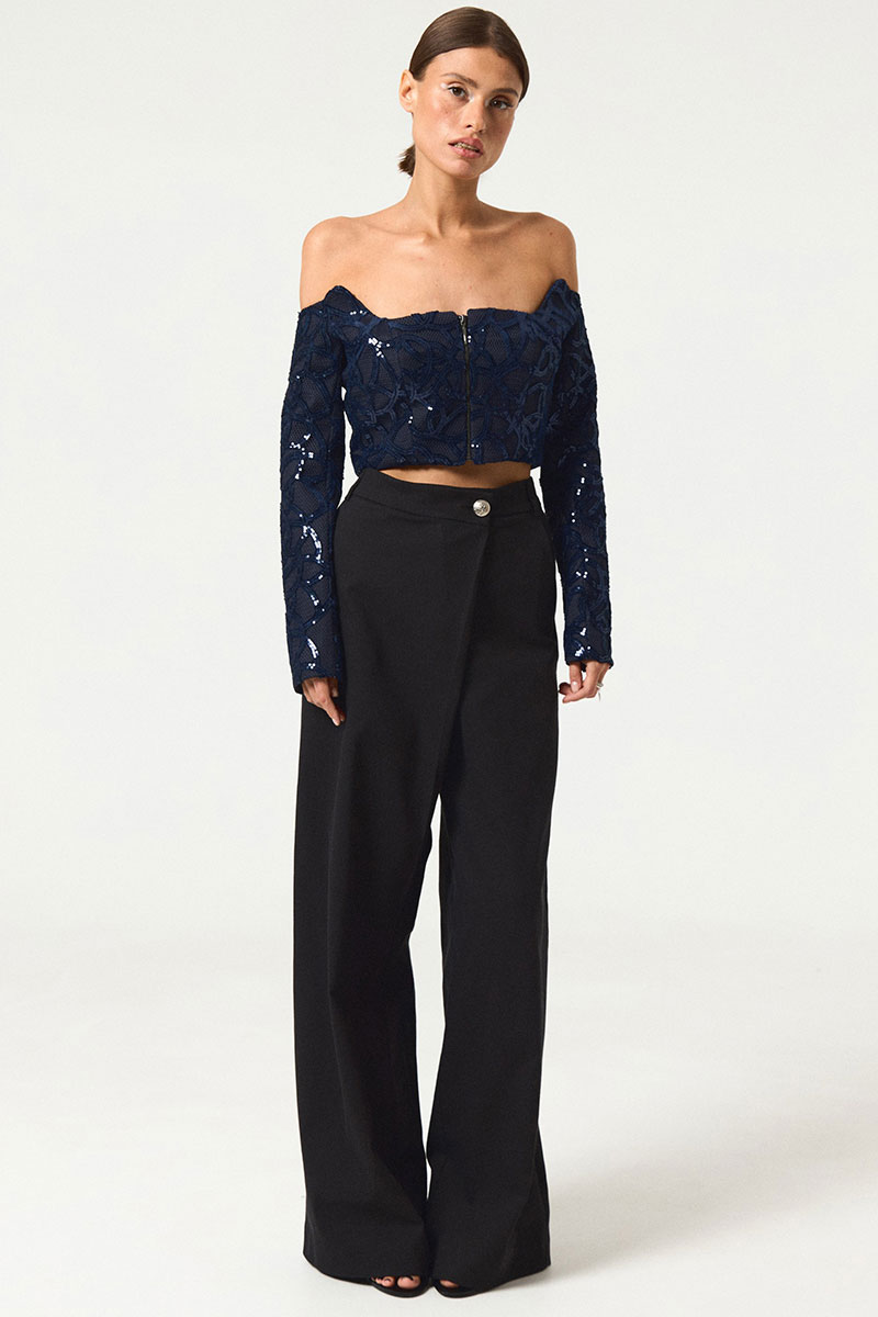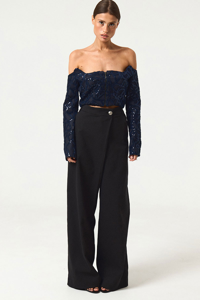 Брюки женские свободного кроя с наклонной складкой по правому переднему полотнищу. Застежка брюк - под складкой - на «тесьму молнию» и пуговицы. Изделие на притачном поясе со шлевками. Передние половинки с боковыми карманами в швах с отрезным бочком. Заднее полотнище с вытачками. На концах вытачек расположены прорезные карманы с листочкой.