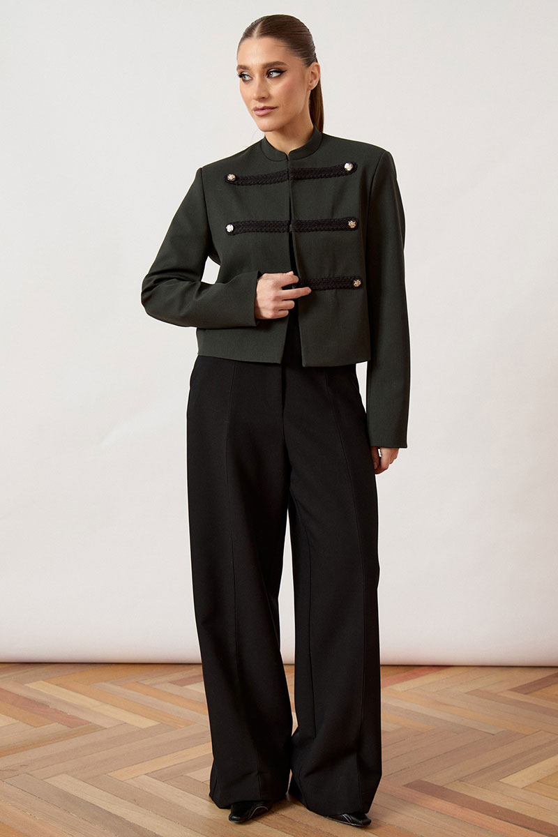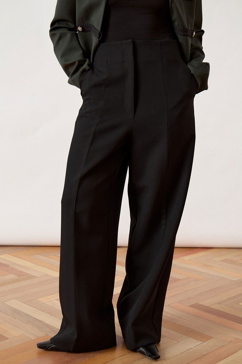Брюки женские из костюмной ткани, свободного силуэта, расширенные от бедра. Модель с высокой посадкой на притачном поясе со шлевками. Передние половинки с двумя глубокими складками-защипами с каждой стороны, переходящими в заутюженные стрелки, и боковыми карманами с отрезным бочком. Сзади расположены талиевые вытачки. Застежка центральная на молнию, скрытую гульфиком, и пуговицу на поясе.