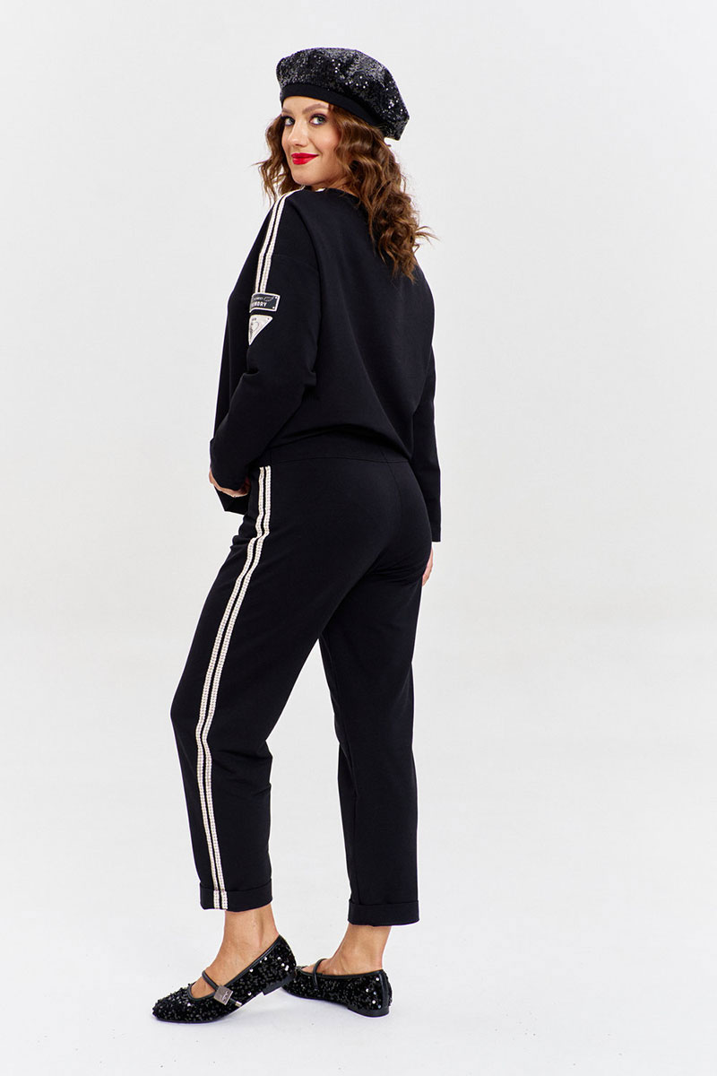 Джоггеры из футера двухнитки, зауженные к низу, с удобными боковыми карманами и поясом на резинке. По бокам золотистые лампасы из декоративной ленты с пайетками.