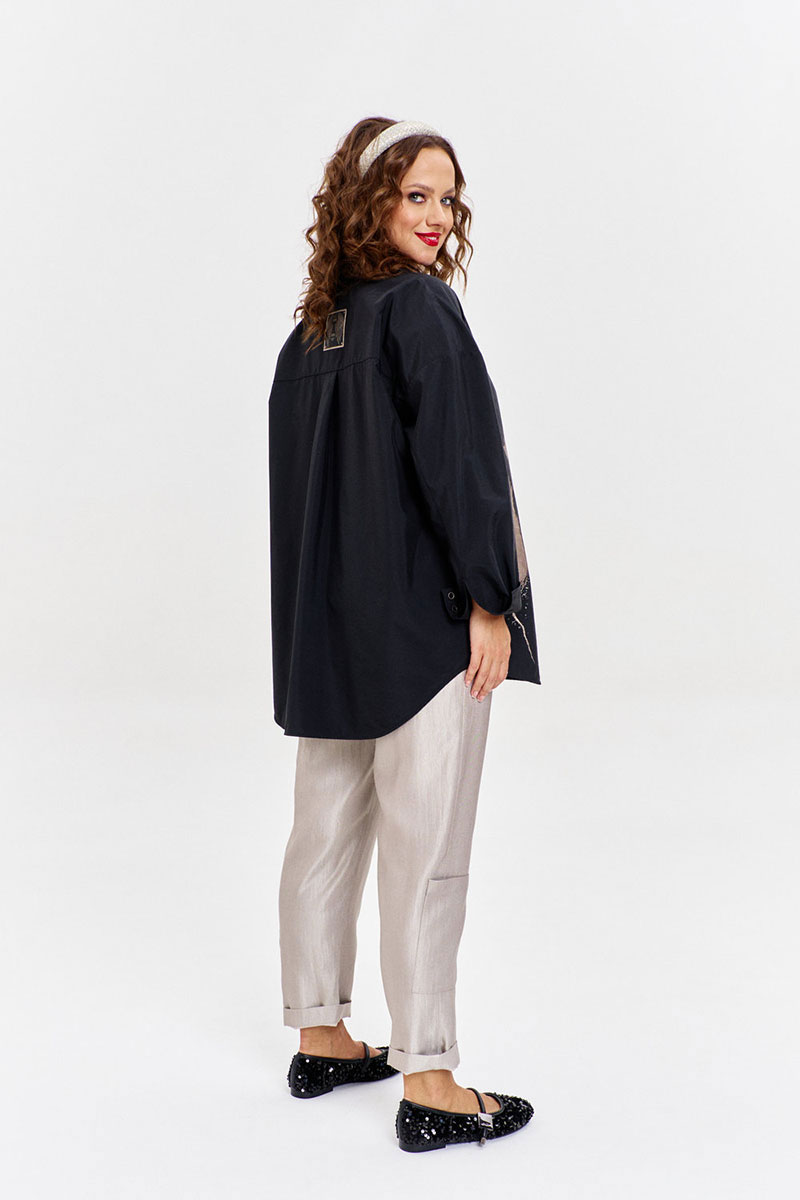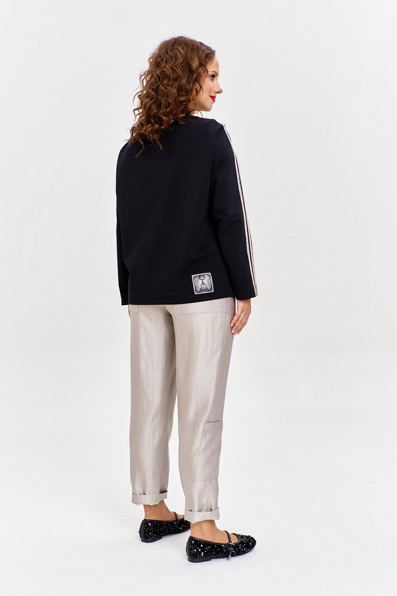 Брюки из вискозной ткани с сатиновым эффектом, зауженные к низу, с застежкой на молнию спереди и резинкой в поясе. В брюках четыре функциональных кармана и два отделочных в нижней боковой части изделия.