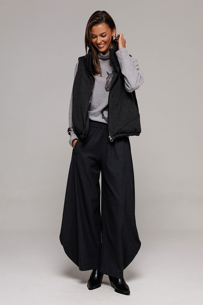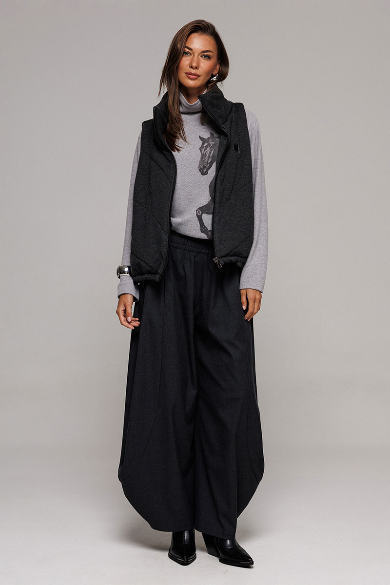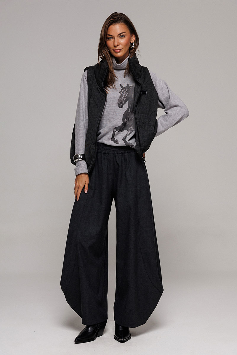 Брюки-шаровары из костюмной ткани свободного силуэта, зауженные к низу, на притачном отсроченном поясе со вставленной в него резинкой. Полочка с карманом в рельефе. По переду и спинке фигурные рельефы.
