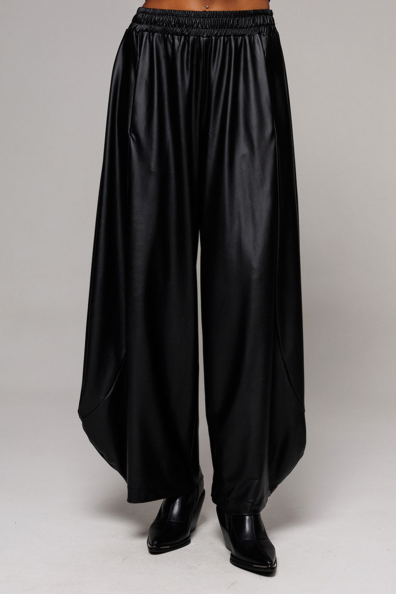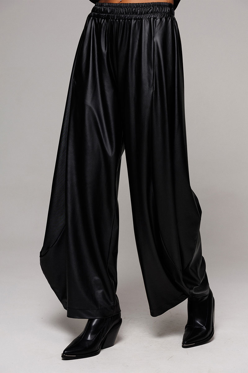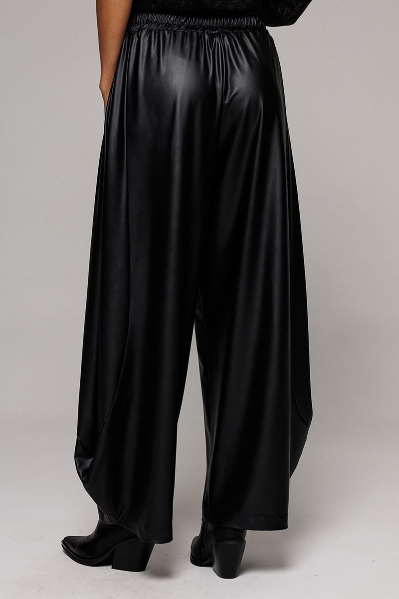 Брюки-шаровары из экокожи свободного силуэта, зауженные к низу, на притачном отсроченном поясе со вставленной в него резинкой. Полочка с карманом в рельефе. По переду и спинке фигурные рельефы.