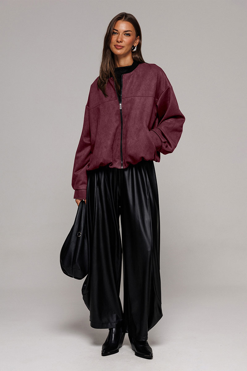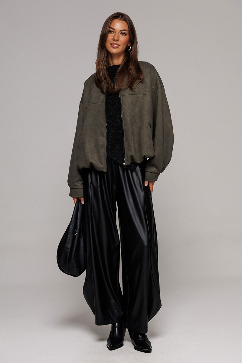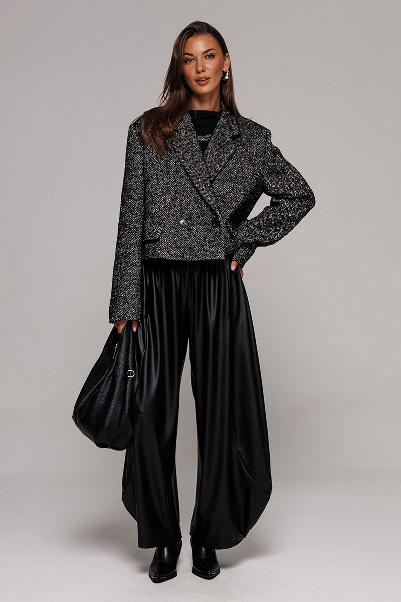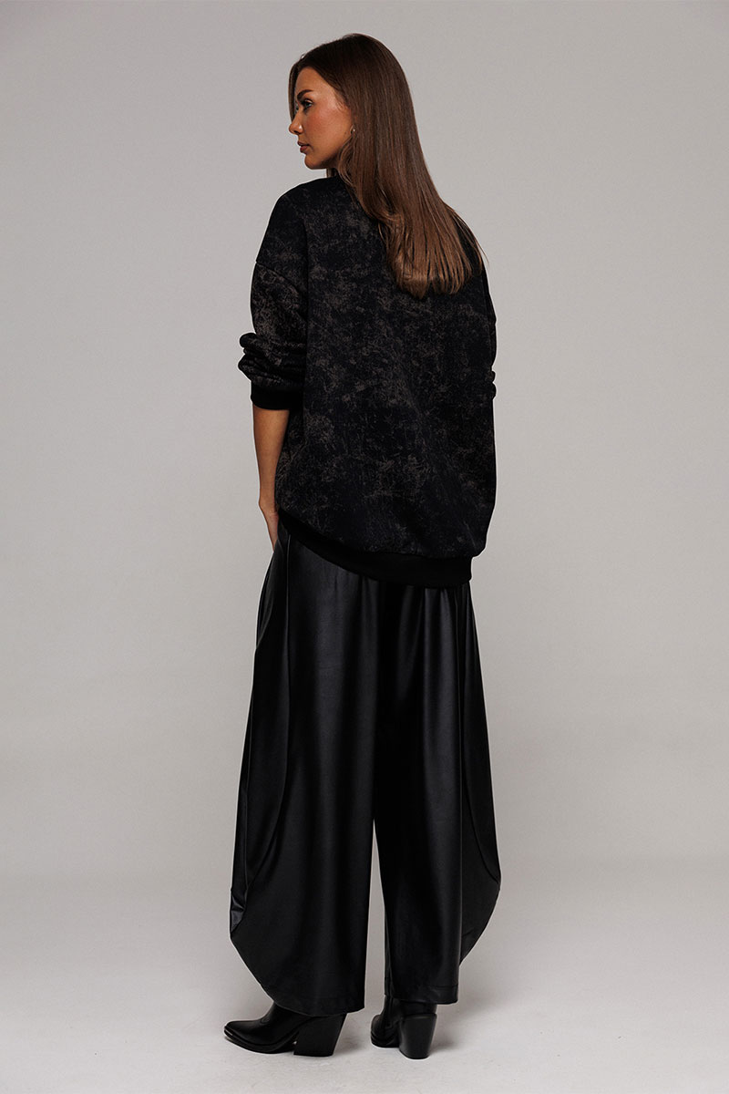 Брюки-шаровары из экокожи свободного силуэта, зауженные к низу, на притачном отсроченном поясе со вставленной в него резинкой. Полочка с карманом в рельефе. По переду и спинке фигурные рельефы.